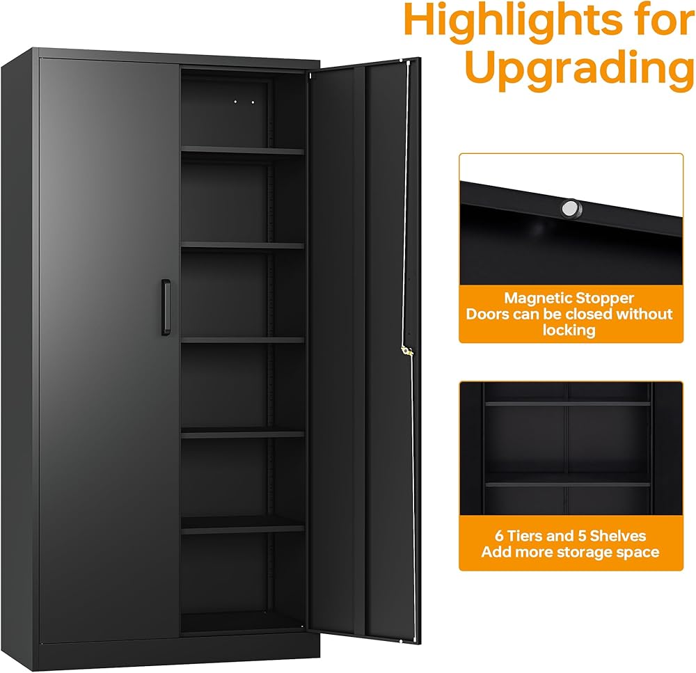 【Easy to assemble】: 71×32 ×16 inch (H x W x D). 2 wing doors with a 180°opening angle. The garage storage cabinet is knock-down structure, when you receive it, you need to assemble. The package comes with detailed assembly instructions, easy to assemble.