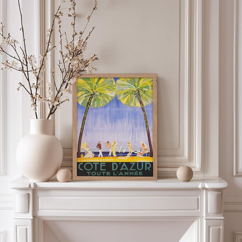 Monem Art Travel Poster - Vintage Cote D'Azur France Wall Art - Colorful Retro Beach Wall Decor - Great Wall Decor Gift for Home, Office, Living Room, 8x10 Beige Framed