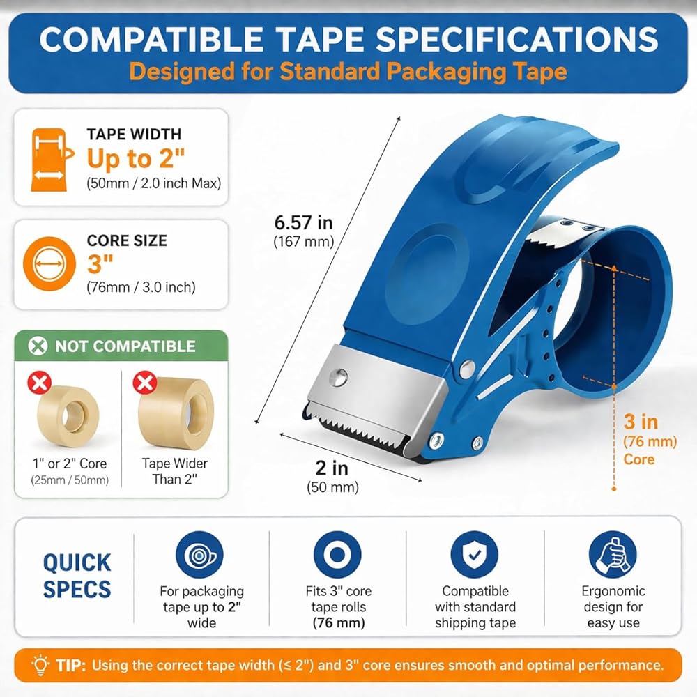 Compatible with Standard 2-Inch Tape: Works with most 2-inch packing tapes, including those with 3-inch inner rolls, making it versatile for any project. These tape dispensers are great for sealing boxes, shipping items, gift wrapping, and organizing your space. A reliable tool for personal, commercial, and office packing. Streamline your packing and shipping tasks with ease!