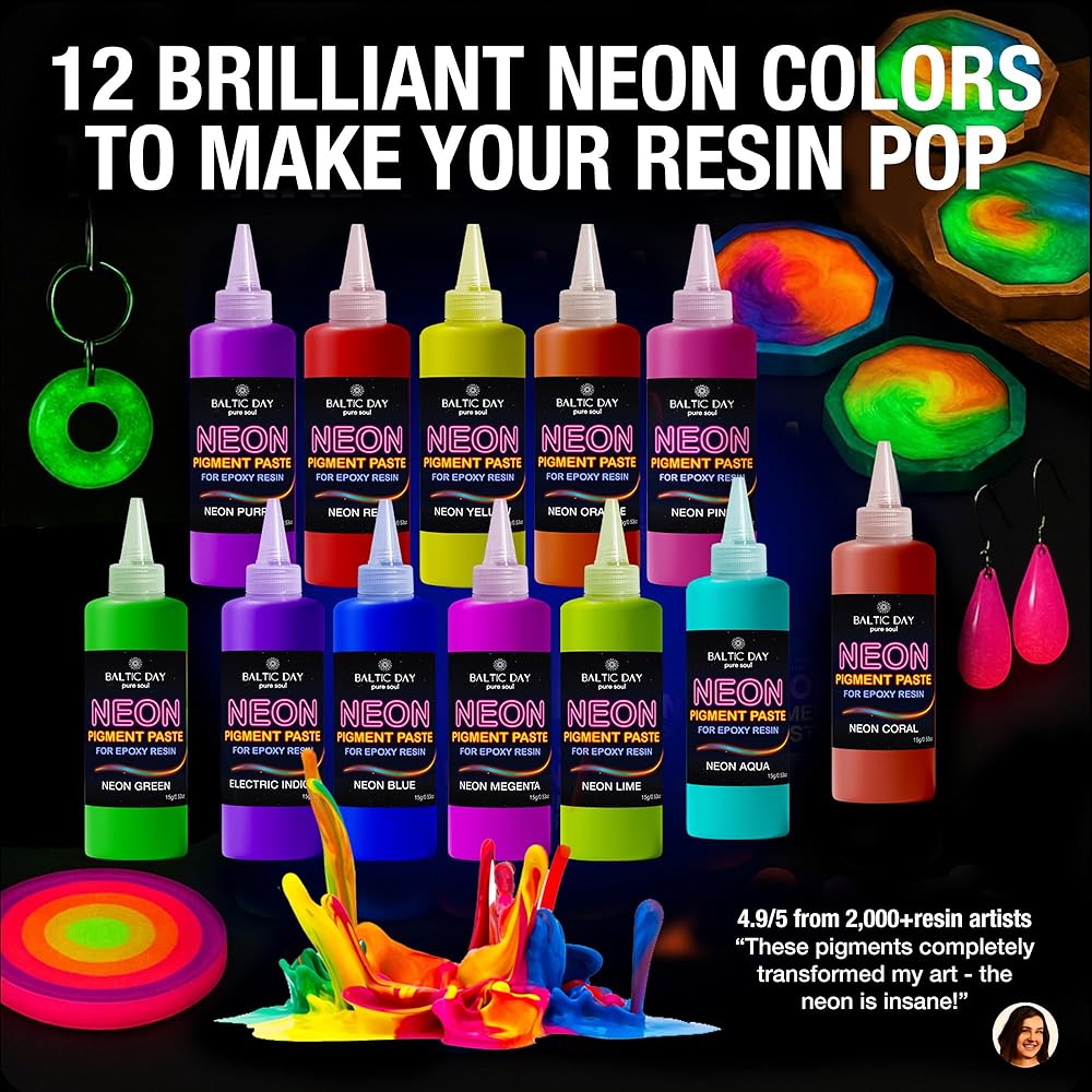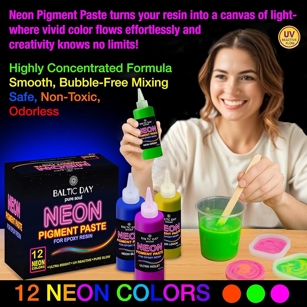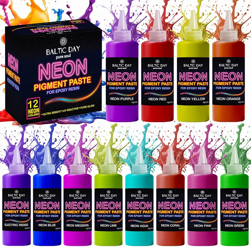 ❤️ 12 NEON PIGMENT PASTE FOR EPOXY RESIN - This premium set includes 12 of the most popular neon pigment pastes for epoxy resin artists. Each vibrant 15g color is carefully selected to give you the essential, high-impact shades you need for glowing resin art, UV-reactive projects, and bold statement pieces.
