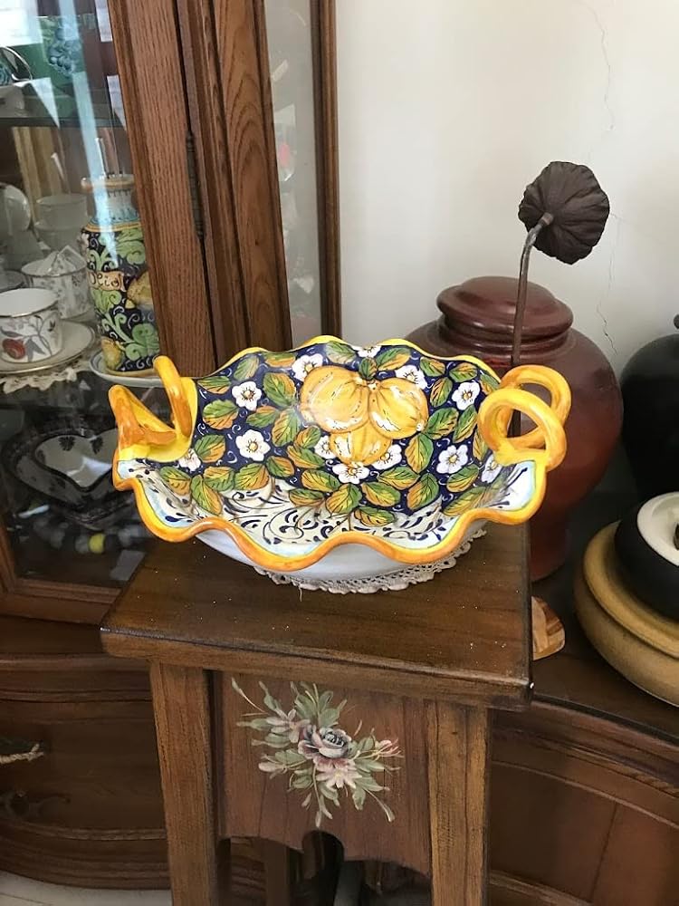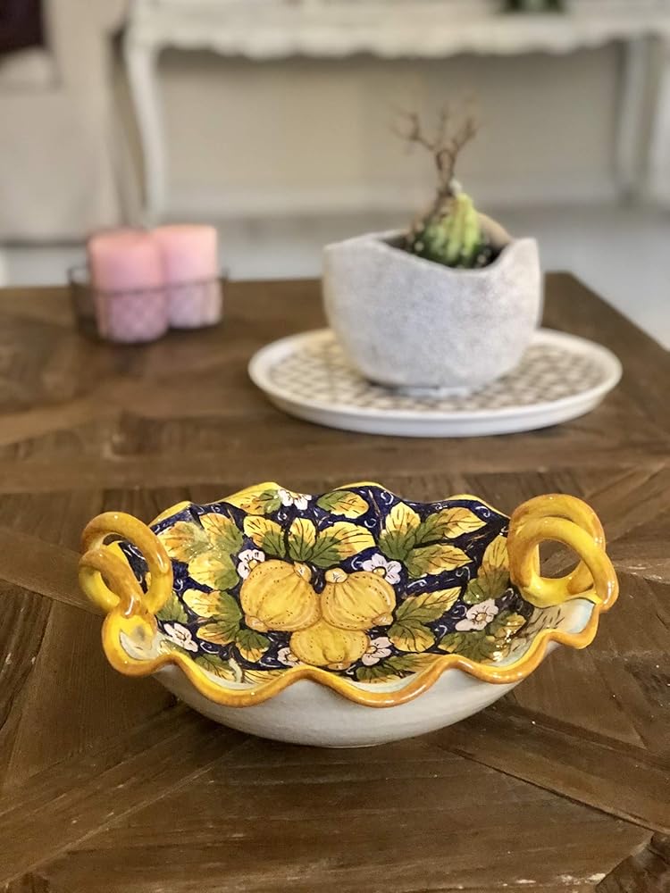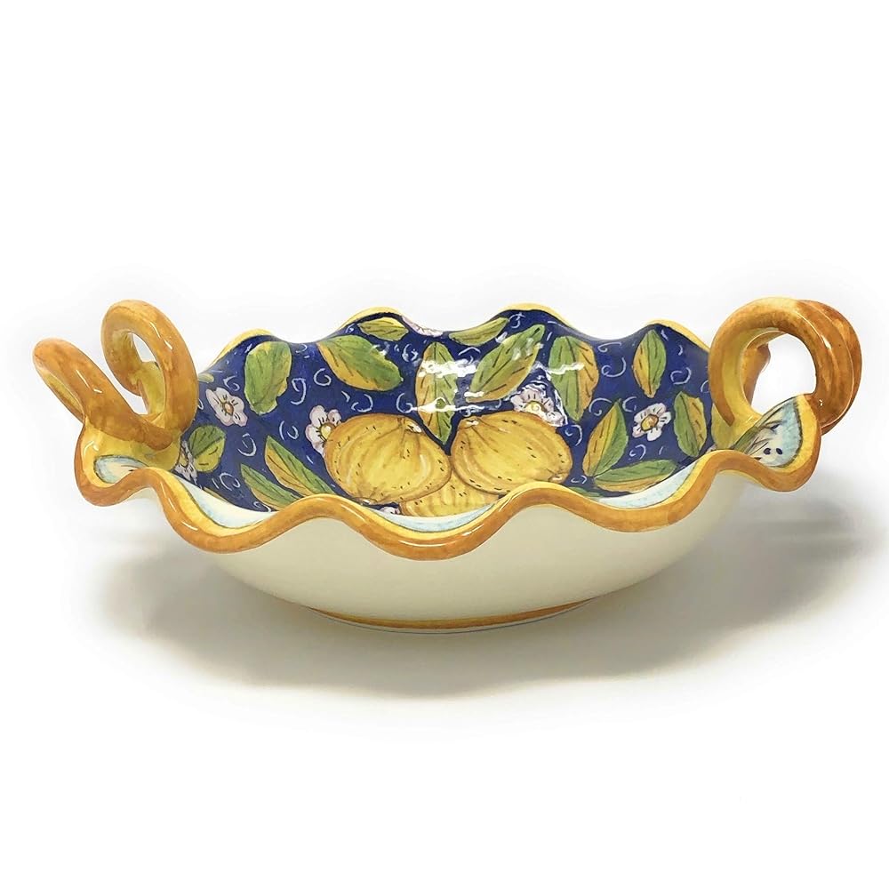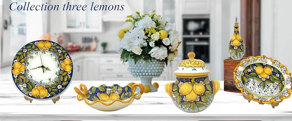 Decoration: Collection three lemons ; Composition of three lemons , leaves, flowers and curls, on a blue background, yellow/orange border