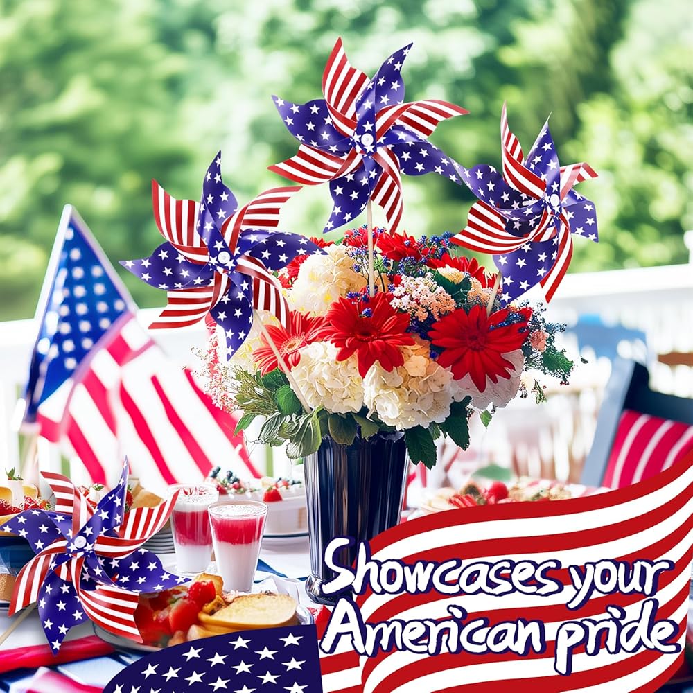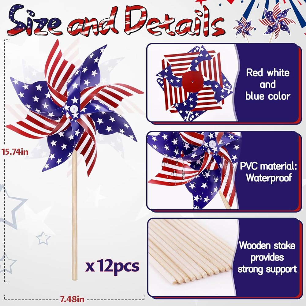 Perfect for Group Celebrations: With 12 pinwheels in one pack, you can decorate a large area or share them with friends and family. Creates a stunning visual display when placed together, turning any outdoor space into a festive Fourth of July decorations outdoor celebration