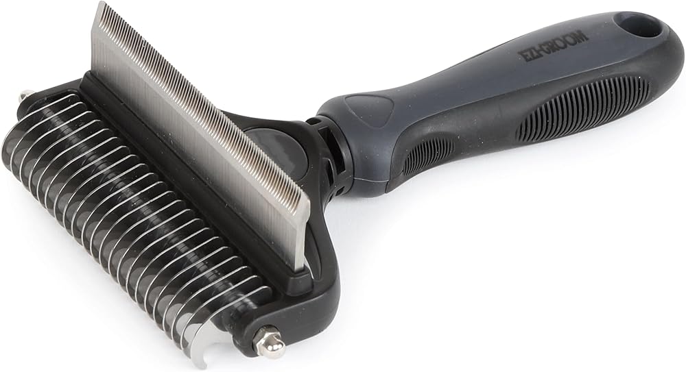 Make light work of grooming with this versatile de-shedding and rake comb. The stainless steel comb promotes healthy skin and a shiny coat. The rake gently and easily removes matted hair from the mane and tail. The multi-purpose comb has a soft-hold grip and contoured shape to make it comfortable and secure in the hand. Not for use on the face or bony joint areas.