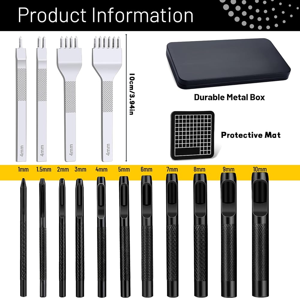LEATHER PUNCH SET: You will get a 4mm 1/2/4/6 leather stitching punches set, 11 hollow punches with different sizes, a cutting mat, and a black metal box. This is a very practical stitching punch set. All the leather punch tools are packed in a metal box, which is neatly stored and easy to carry.