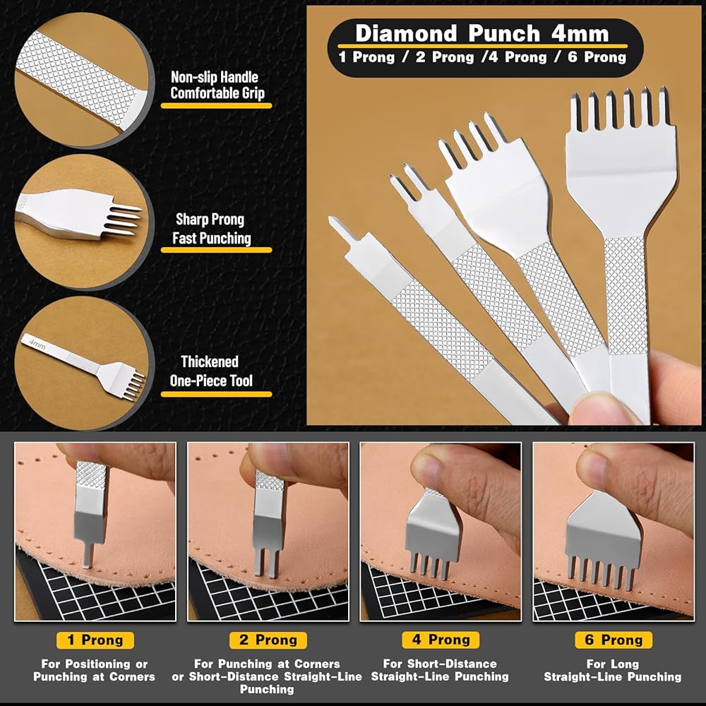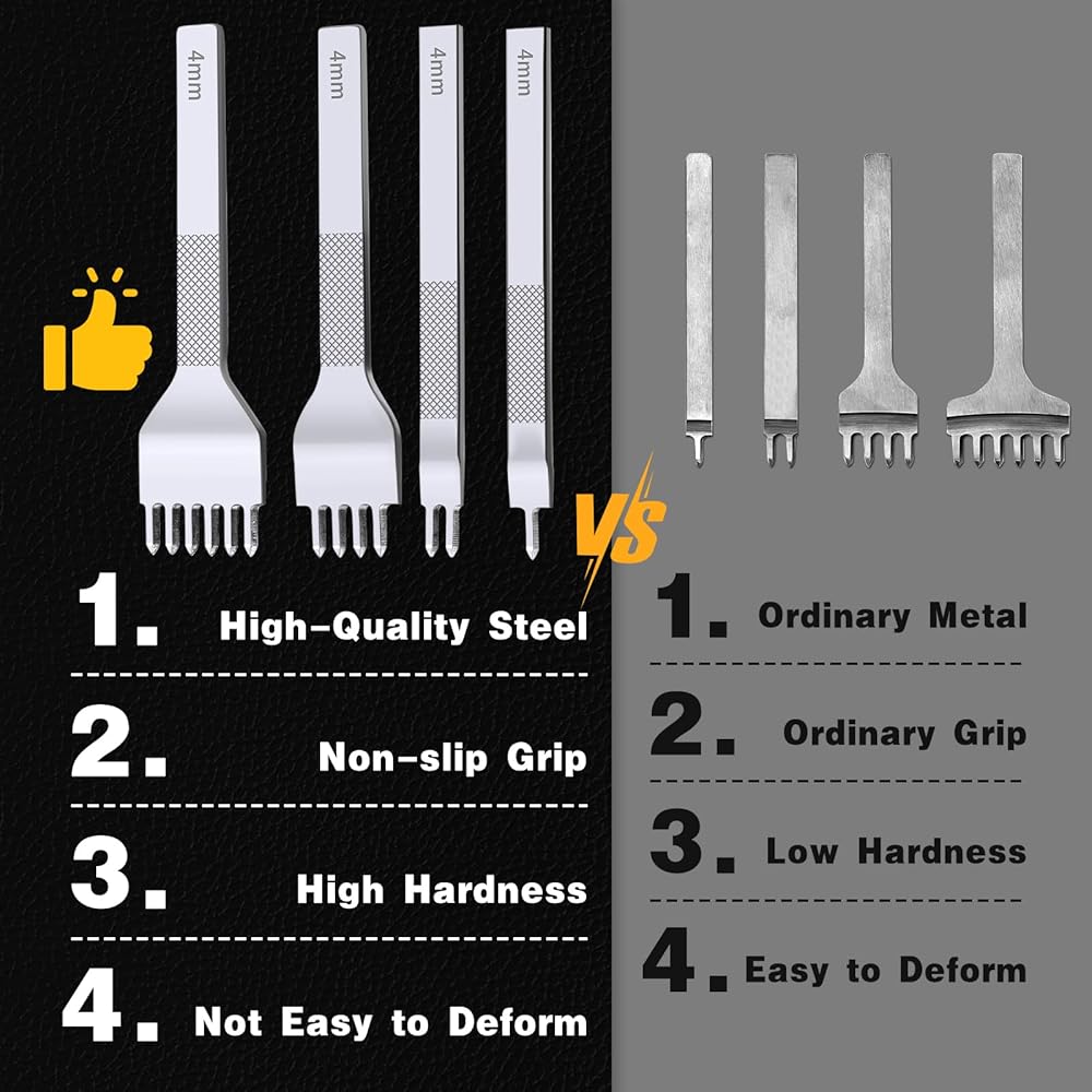 LACING STITCHING CHISEL SET: These 1/2/4/6 leather chisel punches are made of high-quality steel for reliable performance, rust and corrosion resistance, and durability. After fine polishing, the handle is comfortable and the punch tip is sharp. Each punch stitching hole tool has a sharp, well-defined prong to help punch quickly, which can create clean and accurate holes to make your stitches even and beautiful.