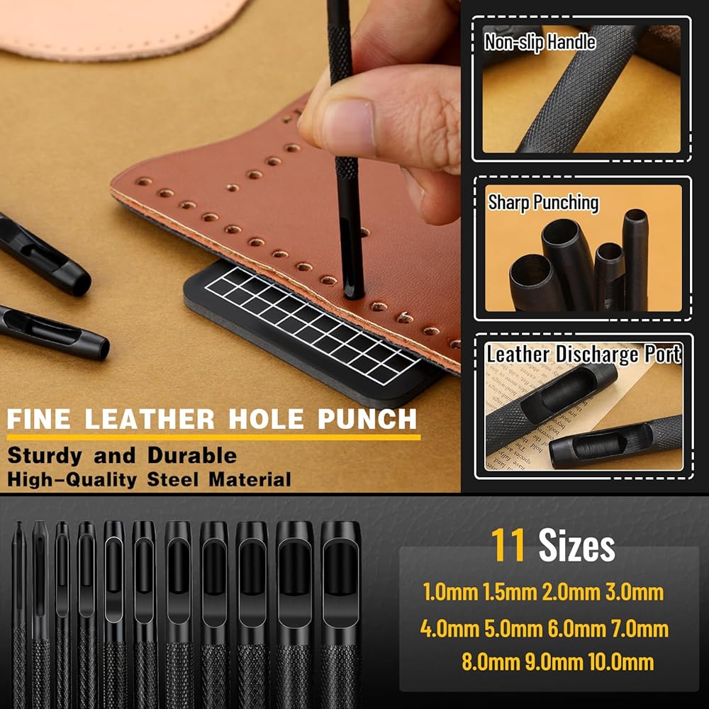 11 SIZES BELT HOLE PUNCHER FOR LEATHER: The leather punch tool set includes 11 round hollow hole punches of different sizes: 1mm, 1.5mm, 2mm, 3mm, 4mm, 5mm, 6mm, 7mm, 8mm, 9mm, 10mm. Our hollow punch tools are made of hardened carbon steel, which is long-lasting, sharp and durable. Each hole punch has a discharge port, so the leather will not be blocked when you punch, and you can punch holes continuously. The handle of the hole punch adopts a non-slip design, which is easier to hold.