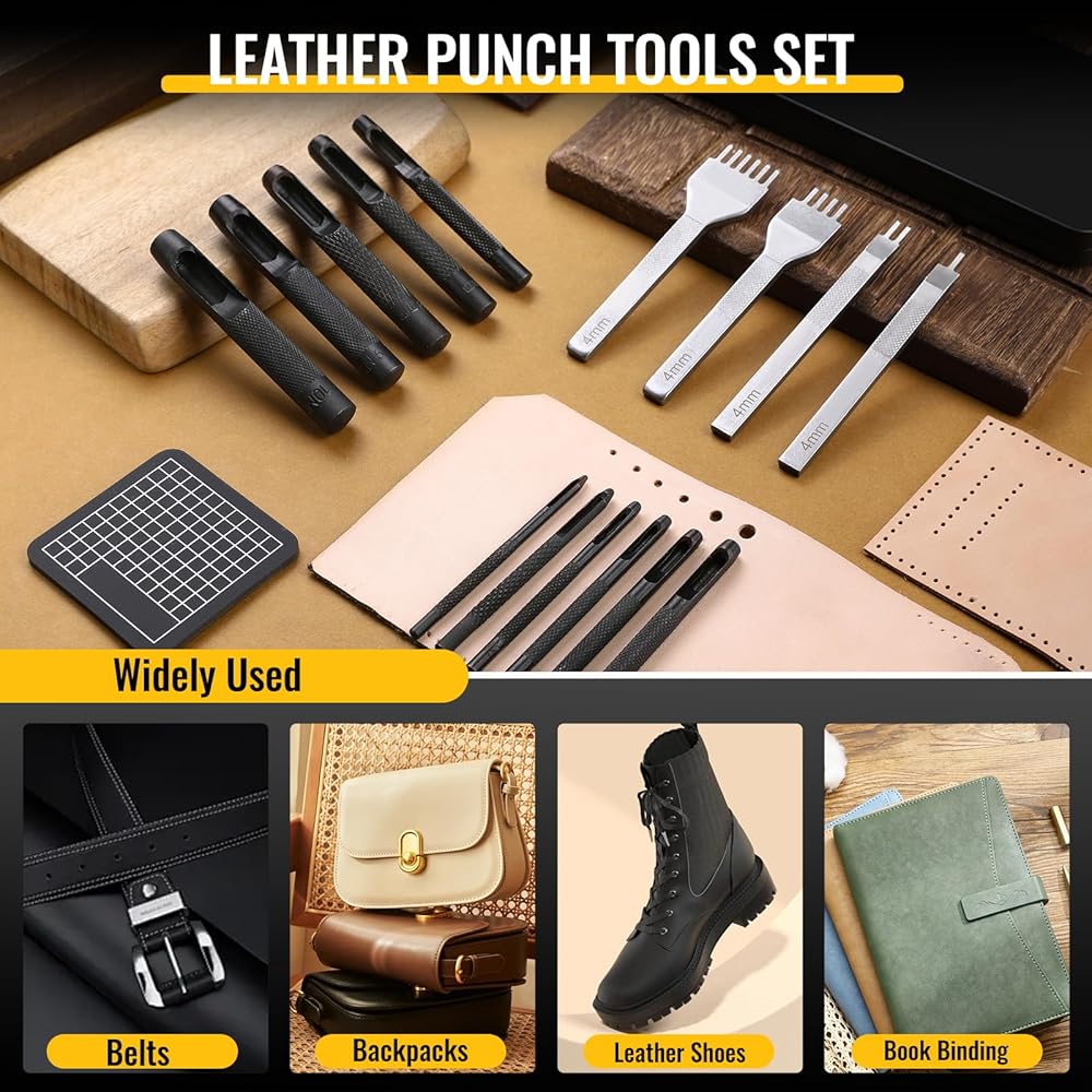 EASY TO USE: These leather punching tools are ergonomically designed and can be easily operated by both beginners and experienced craftsmen. Place the punch on the fabric you need to punch holes in, with the Punch Pad underneath, and hit the punch with a hammer to complete the punching. Leather lacing stitching punches can punch diamond-shaped holes, which is suitable for punching holes before stitching. The round hole punches are especially suitable for punching belts, watch straps, purses, canvas, clothes, paper, etc.