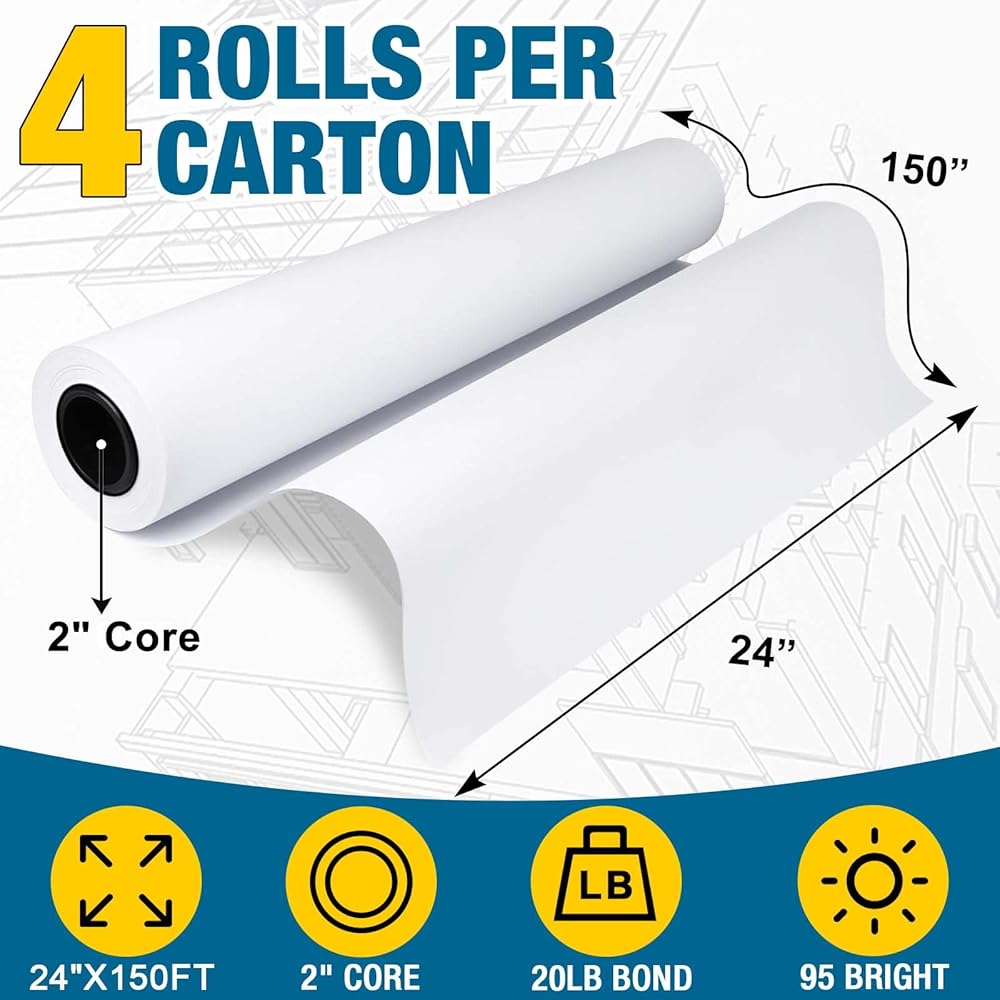 Wide Format Paper 24" x 150' - 4 Rolls Plotter Paper, 20lb CAD Bond Rolls on 2" Core, Printing paper for Inkjet HP, Canon, Epson Printer, Acid-free Bond Rolls for Blueprint, Poster, Drafting