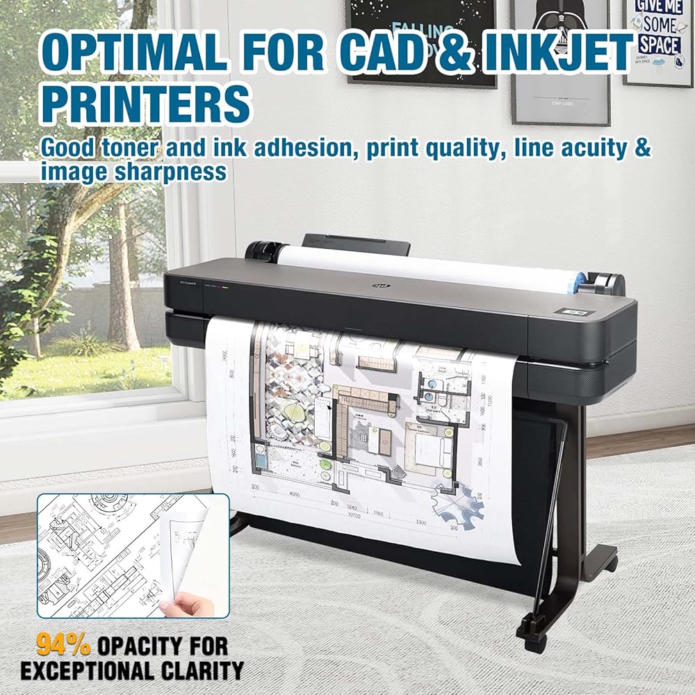 ✅【Advanced Material for Superior Performance】Designed for demanding professional use. Crafted with innovative materials, our wide format paper features 94% opacity for clear, double-sided printing and drawing with no bleed-through. Its optimized 6% moisture content reduces static buildup—minimizing dust attraction and paper jams—while enhancing dimensional stability to prevent curling and warping. The refined surface delivers superior ink absorption, smooth texture, and consistent line quality, making it the ideal medium for technical drawings, schematics, and high-accuracy plotting.
