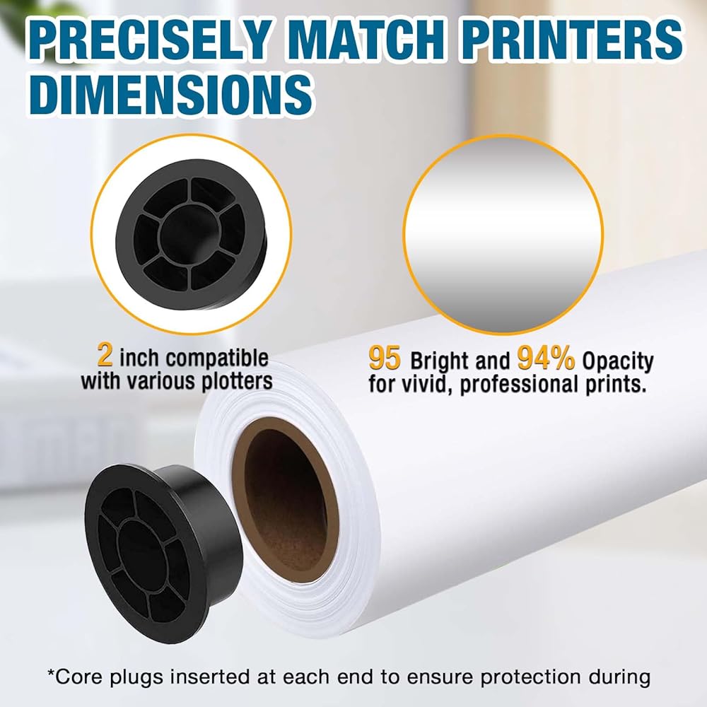 ✅【4 Rolls, Zero Hassle – Print Like a Pro!】Tired of running out of paper mid-project? This value pack includes four individual rolls, each measuring 24 inches wide by 150 feet long, providing a total of 600 feet of plotting capacity. Each roll is precision-cut to 2-inch cores which fit 99% of standard plotter printers. The precise sizing and clean cuts ensure smooth loading and uninterrupted printing, while the generous quantity provides an extended supply for large-scale applications like engineering drawings and architectural blueprints.
