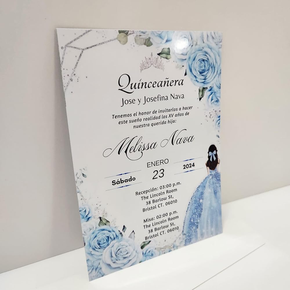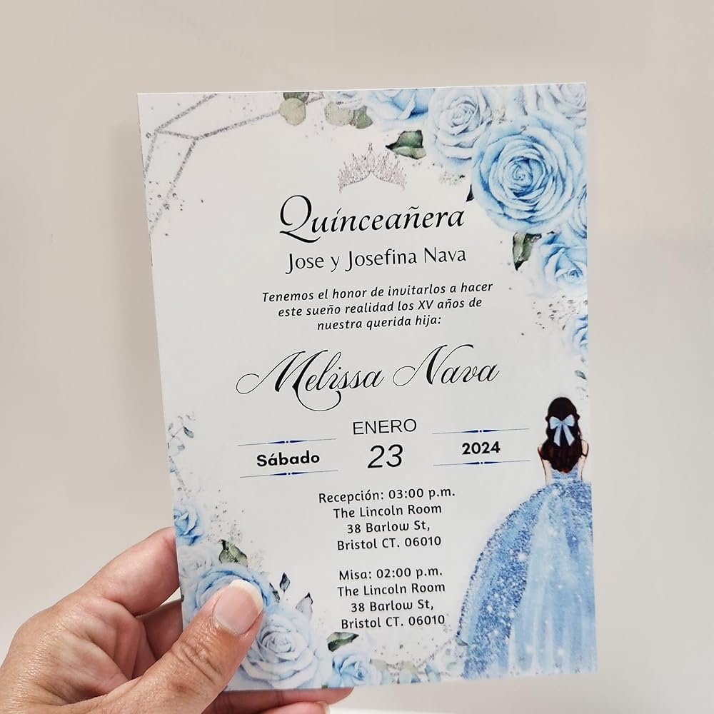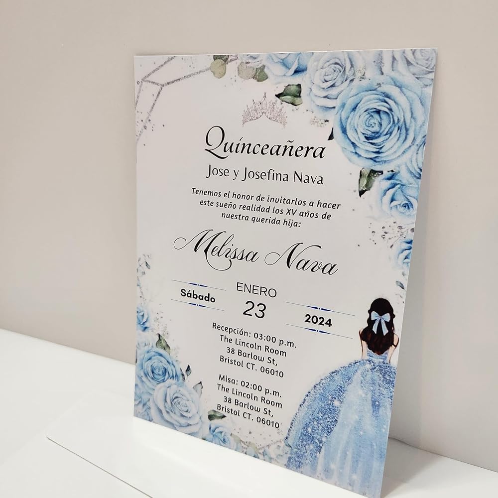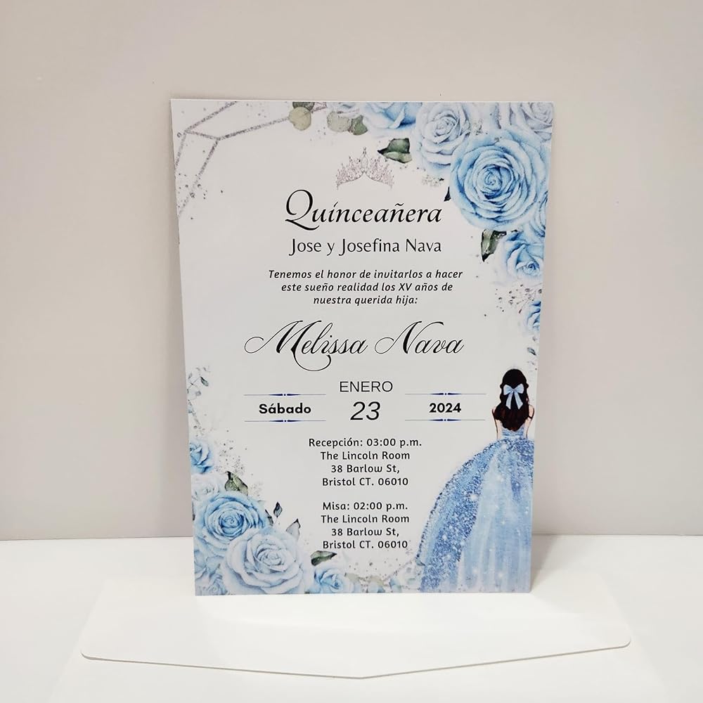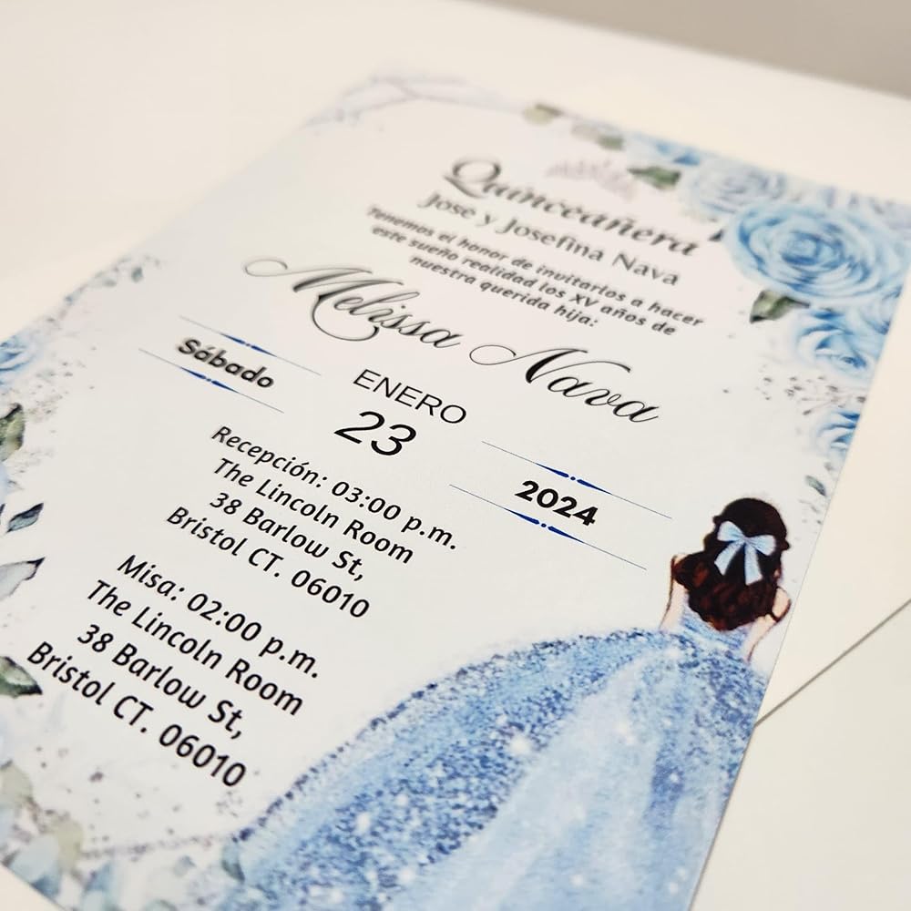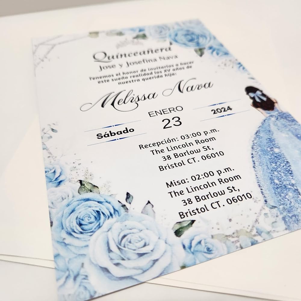 20 Invitaciones de quinceañera, celeste , tarjetas de invitaciones con sobres, invitaciones con sobres, XV Anos, Mis Quince, Quinceañera, tarjeta quinceañera personalizadas, tarjetas para 15 años, vestido quinceañera. Impresa en papel brillante full color. Tarjeta personalizada.