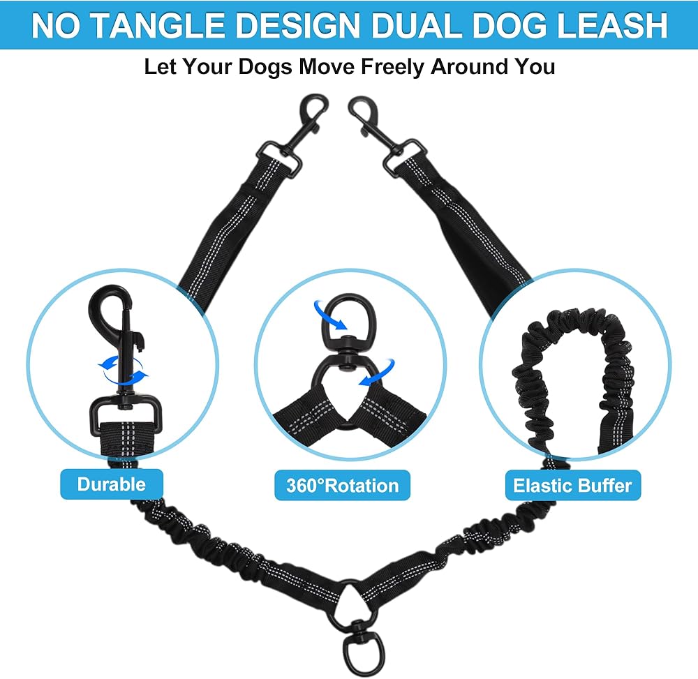 Hands-Free Convenience for Multi-Tasking Pet Owners: This dual leash system features an adjustable waist belt and bungee leash design, allowing you to walk two dogs comfortably while keeping your hands free. Ideal for jogging, hiking, or running errands, the hands-free functionality provides flexibility and ease of use. The bungee system absorbs shock, reducing pulling and ensuring a smoother experience for both you and your pets.