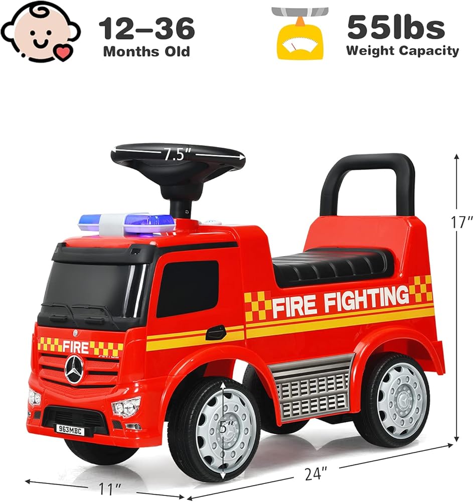 【Cool Truck Appearance】: Designed in the red truck style with bright headlights, this Licensed Mercedes Benz kids ride on push car is the perfect gift for kids 18-36 months and gives them the ultra real riding experience. And the steering wheel comes with honk, whistle and car start sound for real fun. Notice: the required 2x1.5V AA batteries is not included in the package.