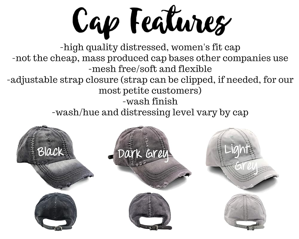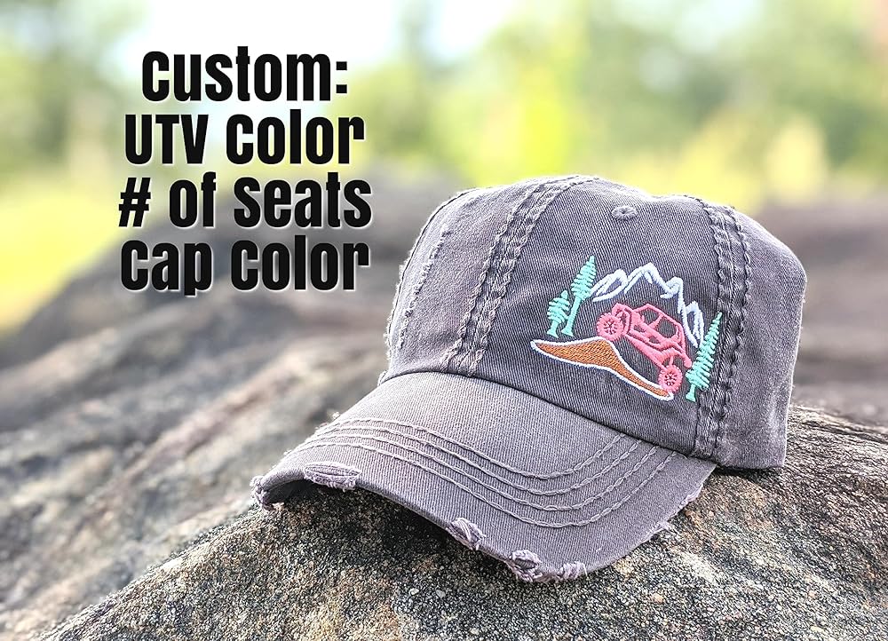 Women's distressed, 100 percent cotton, embroidered utv/sxs hat. Choose a 2 or 4 seater along with custom cap and thread colors. Optional upgrade to a high ponytail/messy bun cap. Ladies fit, soft, mesh-free cap with matching faux leather back buckle. Handmade in the US - made to order. Price is per cap.
