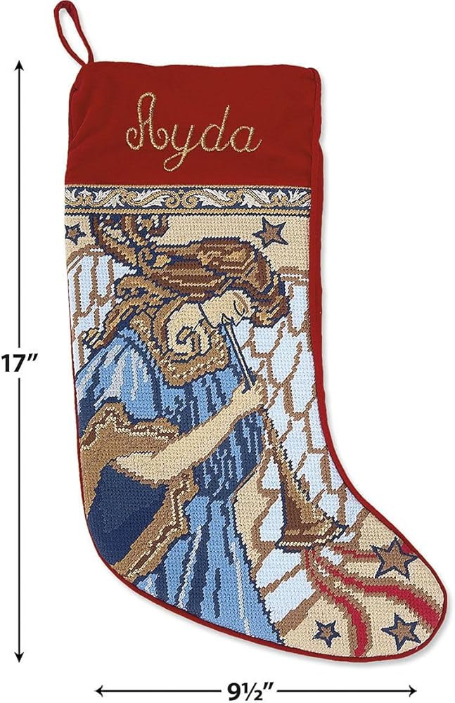 Heirloom needlepoint stockings are lifetime keepsakes! Made of 100% wool with cotton velveteen cuffs, backs, and hang loops, plus shape-keeping cotton linings 7 1/2" x 17" L. Your personalization is carefully embroidered. Specify block or script, gold, silver or cream thread and name up to 12 characters (all CAPS are not recommended for script font only).