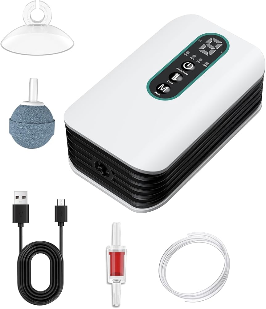 USB Rechargeable: Powered by a built-in 1,800 mAh lithium battery, this oxygen pump is easily chargeable via USB with a phone charger, power bank, car charger or laptop. A reliable backup air source during travel, power outages or emergencies