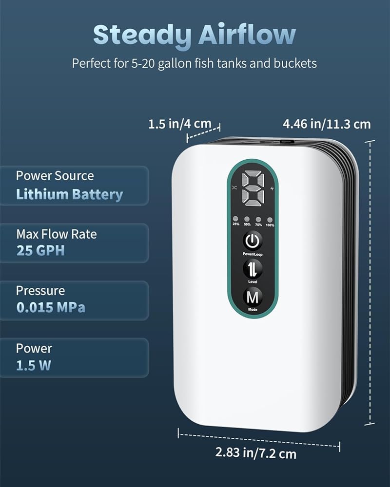 Steady Output: Max flow rate: 25 GPH; Power: 1.5 W; Pressure: ≥ 0.015 MPa. This aquarium air pump ensures consistent aeration, creating an oxygen-rich environment to keep fish lively, healthy and comfortable. Ideal for 5-20 gallon fish tanks or buckets