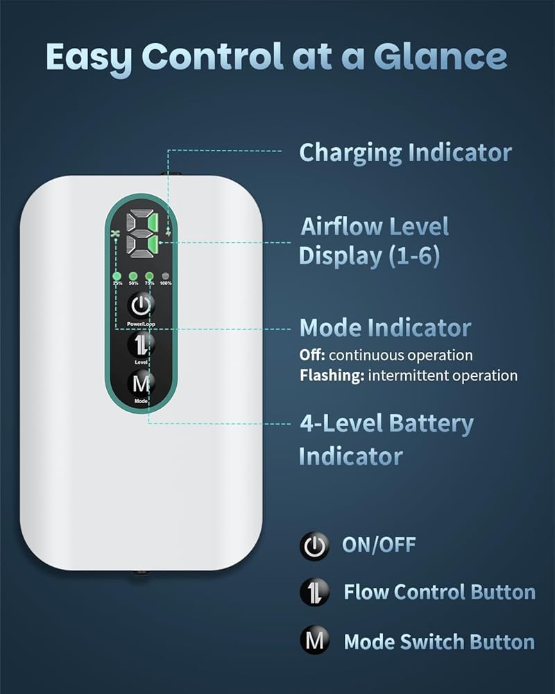 Dual Working Modes: Feature 2 modes for flexible use! Continuous Mode for uninterrupted air flow, and Intermittent Mode (10s on/10s off) for extended battery life. Enjoy up to 26 hours of continuous use in normal mode and 30 hours in intermittent mode