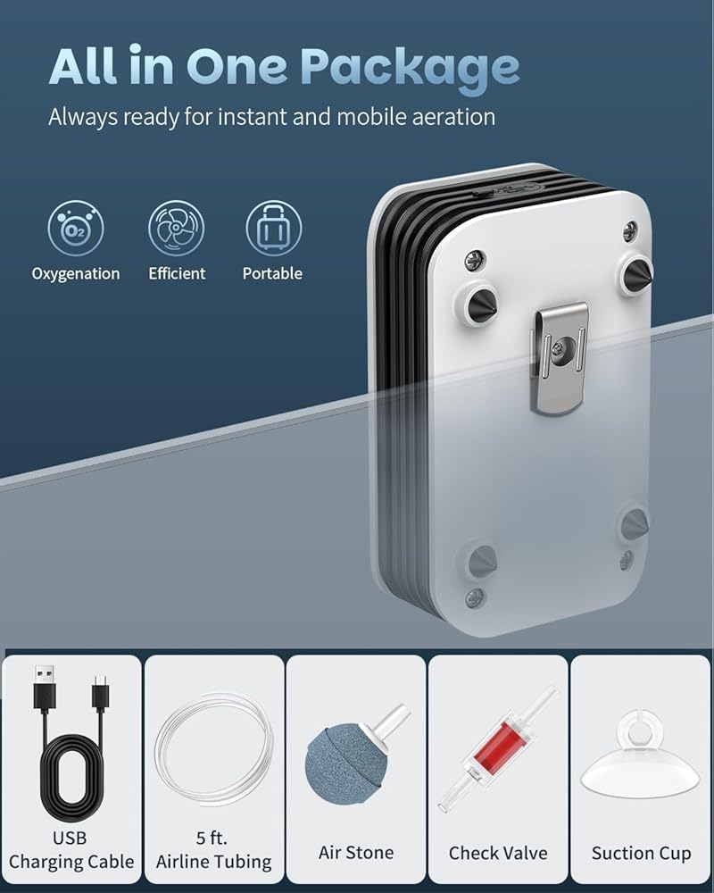 Versatile Use Anywhere: All-in-one aeration kit, including a 5-foot airline tubing, air stone, check valve and suction cup. Great for aquariums, hydroponics, outdoor fishing, live bait transport, fresh fish markets or mobile use