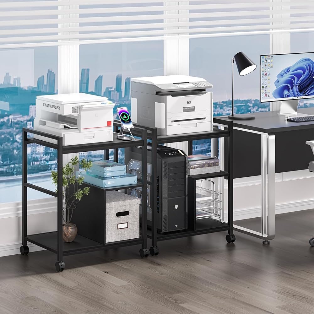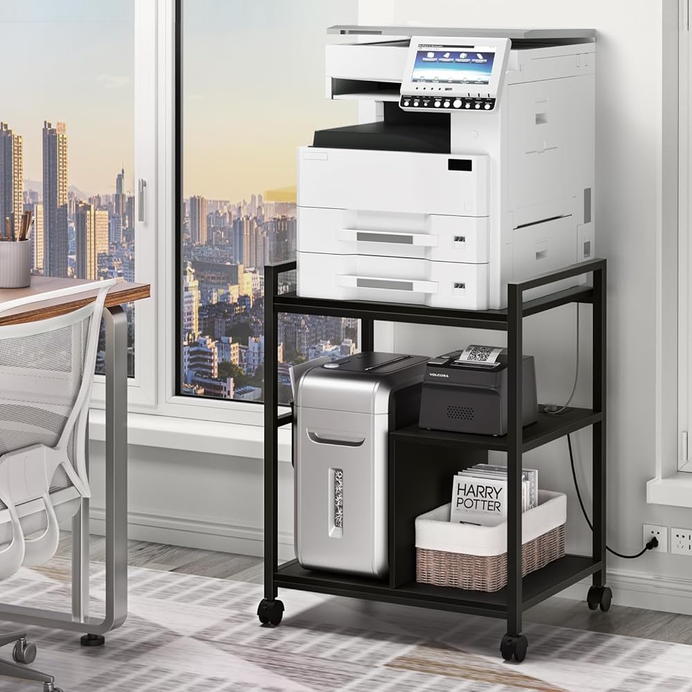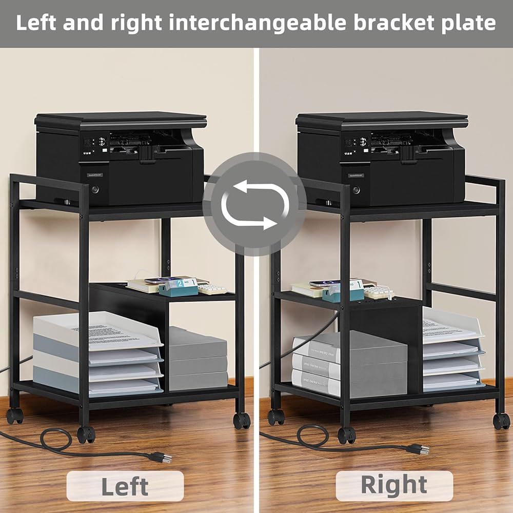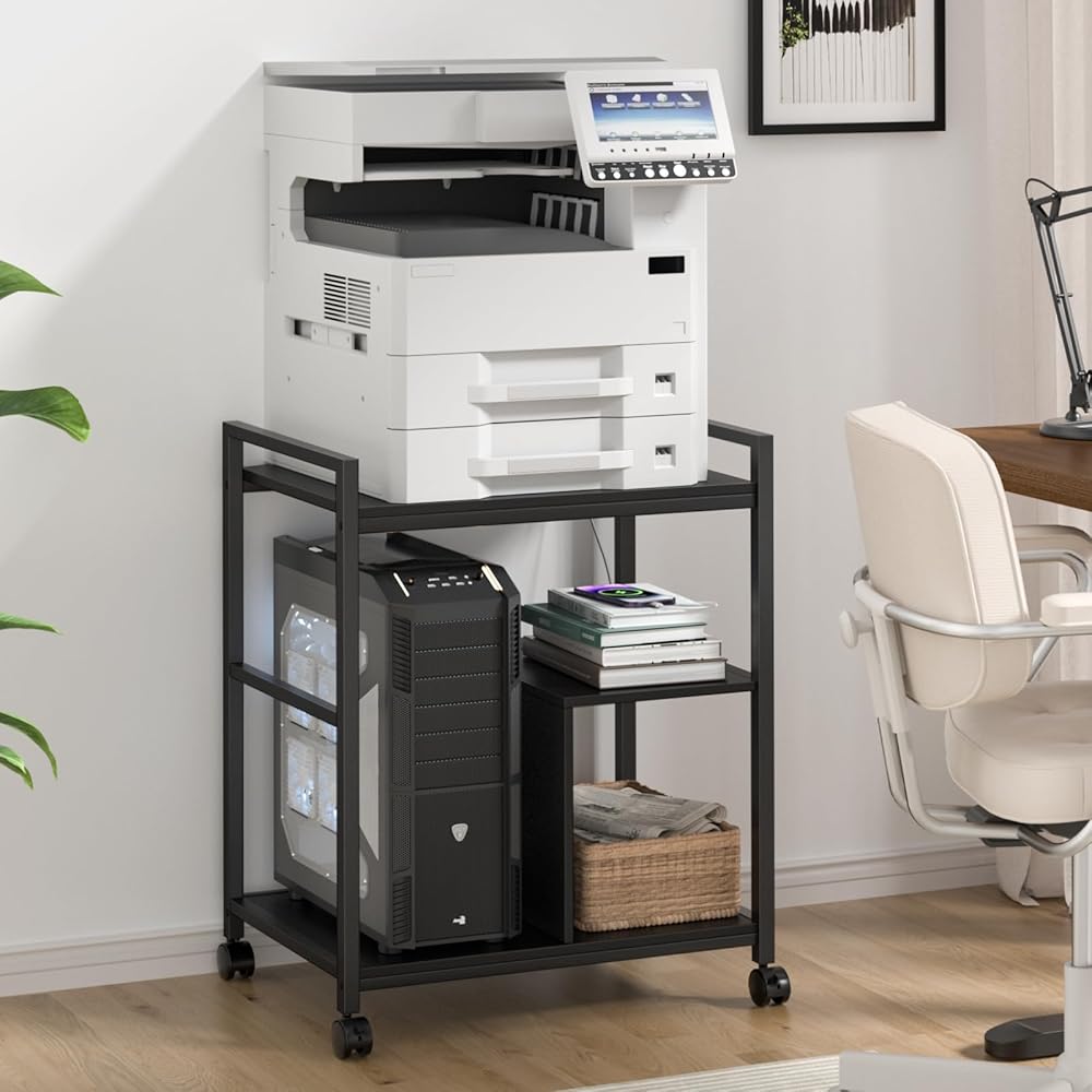 【Solid & Multi-Purpose】The 3-Tier printer table adopts a sturdy steel pipe frame and thick wooden panels as support, giving excellent load-bearing capacity.It can support up to 145 lbs.Not only can it be used as a printer cart, but also it can be used as a shredder rack, file cabinet, office storage rack,which is a good item thing in your home and office.