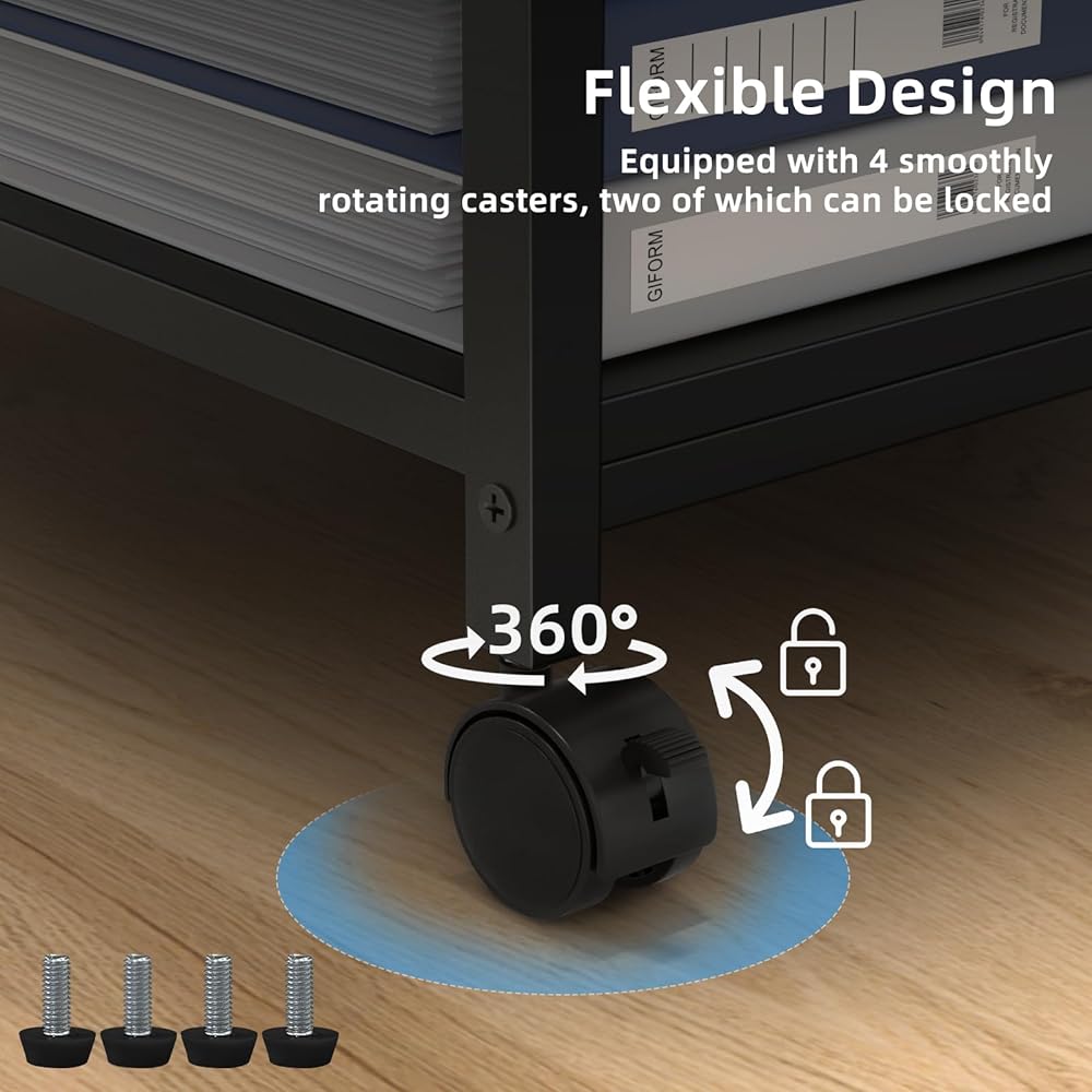 【Includes Casters and Adjusting Feet】The four wheels of the large printer table with storage can rotate 360 degrees, and two of them can be locked to provide greater security for your printer and other office equipments.We also offer four solid adjusting feet that you can replace whenever you need them.