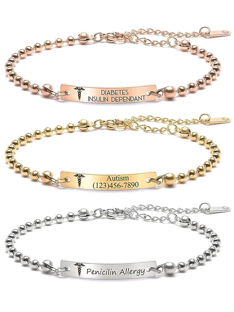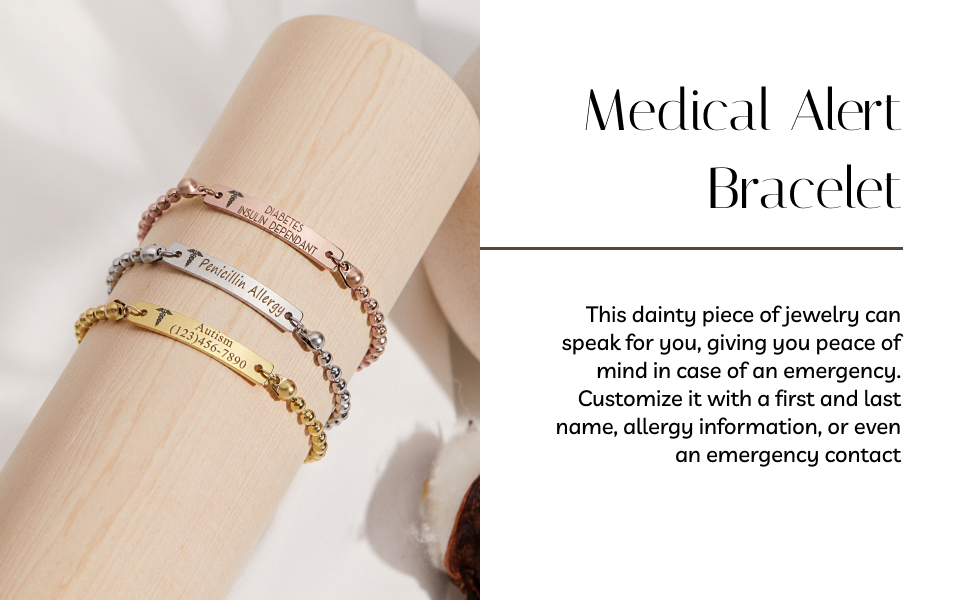 [Personalized Medical ID Bracelet Information] Medical alert engraved bar size: approx. 1.2” x .20” (30mm x 5mm), Chain length: approx. 5.5” + 2.5” extender (14cm x 6.5cm) / Gold Plated, Silver Plated, Rose Gold Plated Stainless steel. This is better quality than brass or alloy materials. It's built to last as well with tarnish resistant materials!