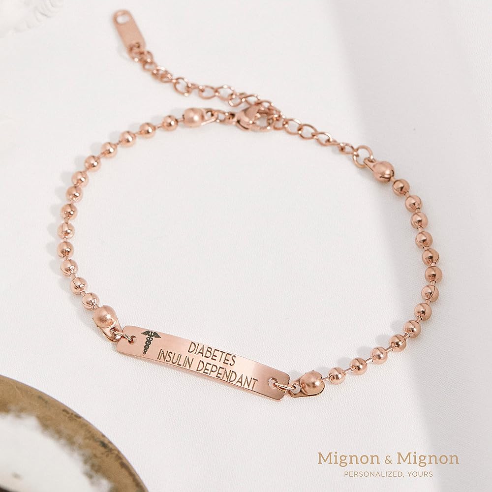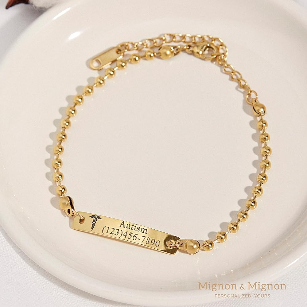 [Mignon and Mignon Medical Bracelet] This dainty piece of jewelry can speak for you, giving you peace of mind in case of an emergency. Customize it with a first and last name, allergy information, or even an emergency contact. Make it even more special by personalizing both the front and back sides of our nameplate jewelry.