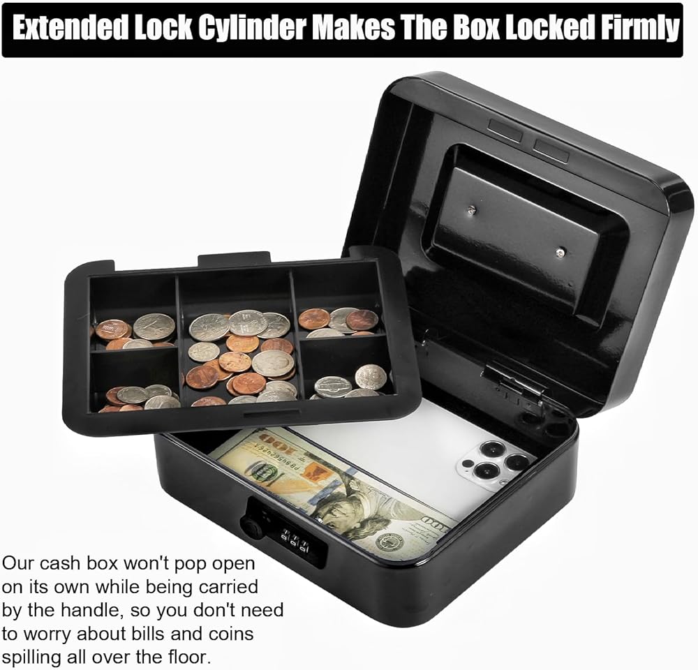 UNIQUE DESIGN: Metal Safe Lock Box for MoneyTiered tray design allows for full view of entire working area.When the cash box is opened, a five-compartment removable coin tray is available for use. The next layer of the coin tray provides ample storage space to ensure easy organization and placement of banknotes.