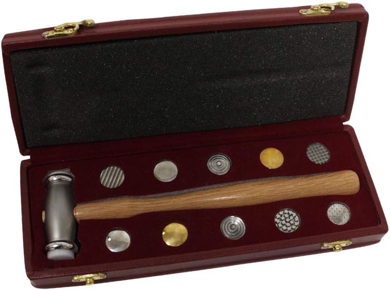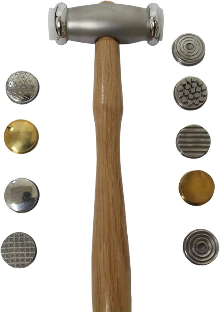 BENCH WIZARD 6-in-1 10" Multi-Head Hammer (PH-19704) is a revelation for metal crafters and jewelry makers alike. With this versatile tool, you can seamlessly infuse individuality into each of your creations, whether they be jewelry items, metal projects, or even designs pressed into wax or clay. Each of the six meticulously crafted heads on this hammer has a distinctive design. With a simple tap, these designs can be impeccably replicated onto the metal or other materials you're working with. Designs range from graduated circles, evoking the precision of a target, to classic stripes, intricate basket weave patterns, and more. The sheer variety allows for limitless creativity, making every project uniquely yours. At 10" (25.4 cm) in length, this multi-headed hammer features a robust wooden handle that ensures durability and provides a comfortable grip. Once you employ this tool in your crafting, you'll leave onlookers wondering about the secret behind your detailed and mesmerizing designs.