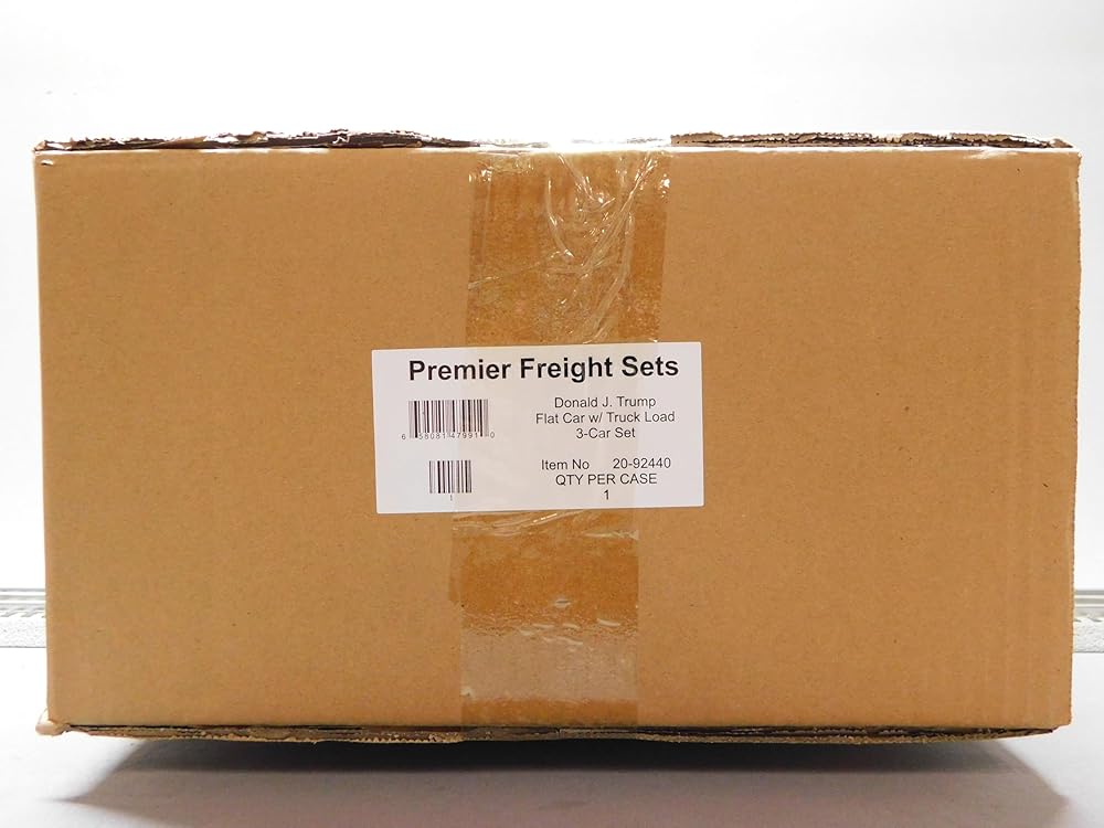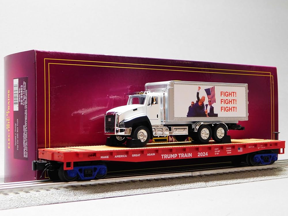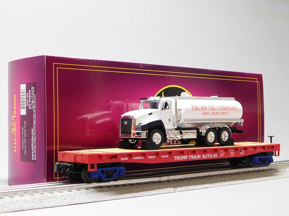 MTH: 20-92440 Donald J. Trump O Scale Premier 3-Car Flat Car w/ Truck Load Set O Gauge The flat car is perhaps the oldest of railroad cars, predating even the steam locomotive. From the very beginning, it was useful for commodities that could not have fit into a covered car. As far back as 1834, the horse-drawn Granite Railway in Quincy, Massachusetts ganged four of its four-wheel flatcars together to ship 60-ton granite blocks destined to be made into columns for the new Boston Court House. On its customer Web site, the Union Pacific Railroad characterizes modern flat cars like this model as available in a variety of lengths, tonnage and capacities for specialized commodities that are not subject to damage from the elements. Attributes are listed as easier to load and unload freight, can drive machinery directly on to the car, and nailable wood (as in our model) or steel floors that allow nail blocking and bracing to the floor for a damage free, secure shipment. For shipping large or bulky items, from machinery and vehicles to steel plates, pipes, and beams, the flat car has been the solution for nearly two centuries. MTH Premier O Scale freight cars are the perfect complement to any manufacturers scale proportioned O Gauge locomotives. Whether you prefer to purchase cars separately or assemble a unit train, MTH Premier Rolling Stock has the cars for you in a variety of car types and paint schemes. Virtually every sturdy car is offered in two car numbers which makes it even easier than ever to combine them into a multi-car consist. Many of MTHs Premier Rolling Stock offerings can also operate on the tightest O Gauge curves giving them even more added versatility to your layout. Features: Intricately Detailed Durable ABS Body Metal Wheels and Axles Die-Cast 4-Wheel Trucks Operating Die-Cast Metal Couplers Colorful, Attractive Paint Schemes Fast-Angle Wheel Sets Needle-Point Axles 1:48 Scale Dimensions Removable 1/50 Truck Per Car O Scale Kadee Compatible Coupler Mounting Pads Garbage Truck Features Trump Figure In Passenger Seat Flashing Headlights Self-propulsion Movement News Conference Audio Clip of Trump Speaking 1:50 Scale PRODUCT SPECIFICATIONS Gauge: O Gauge Min Curve: O31 Dimensions: 14 1/2" x 2 1/2" x 4 1/2" (Per Car)