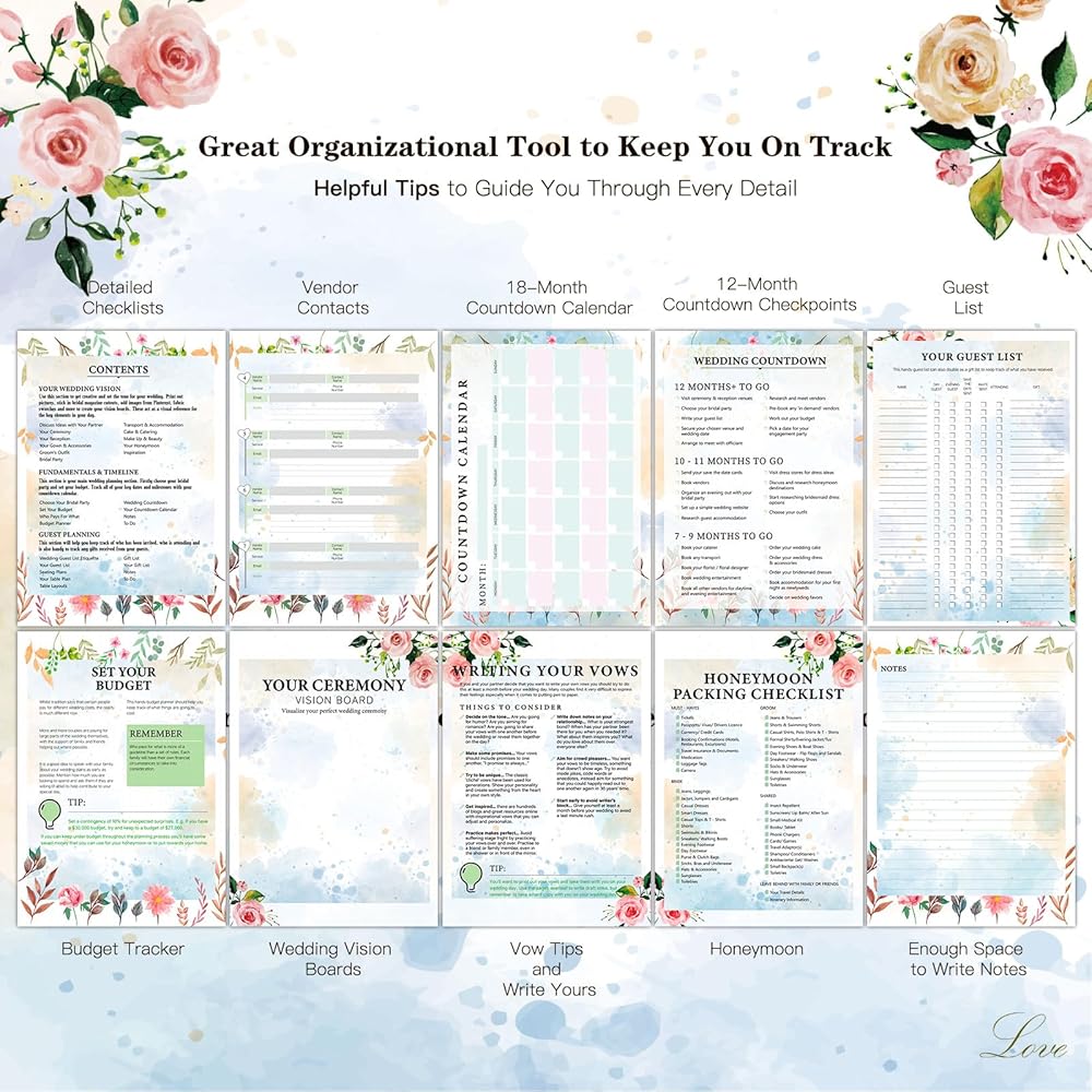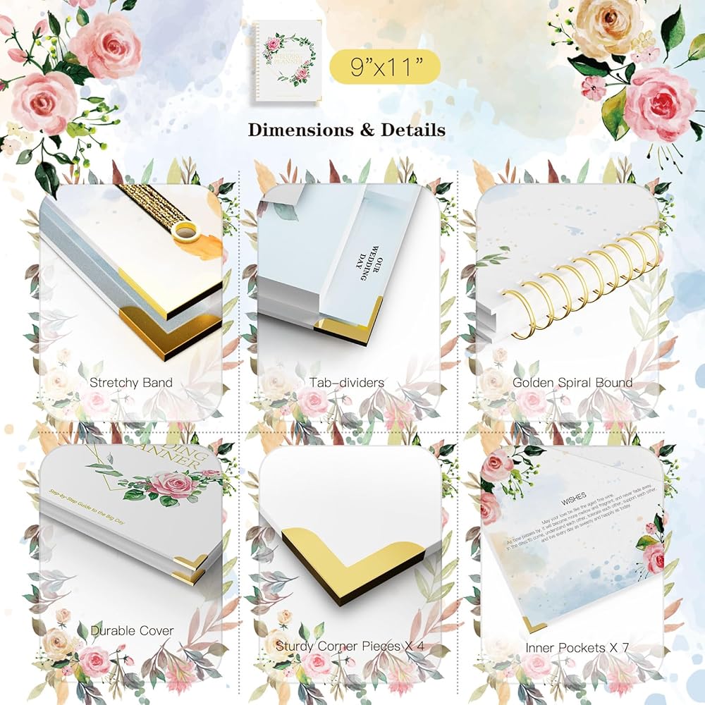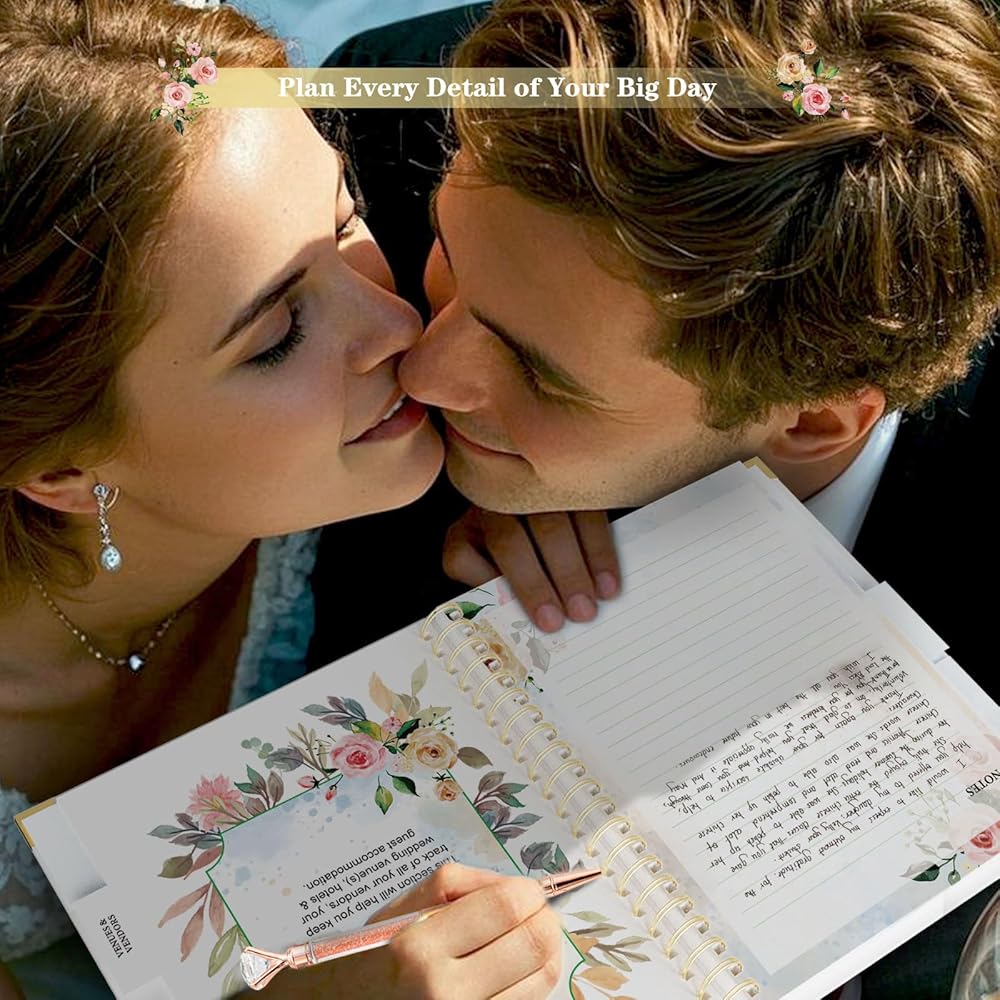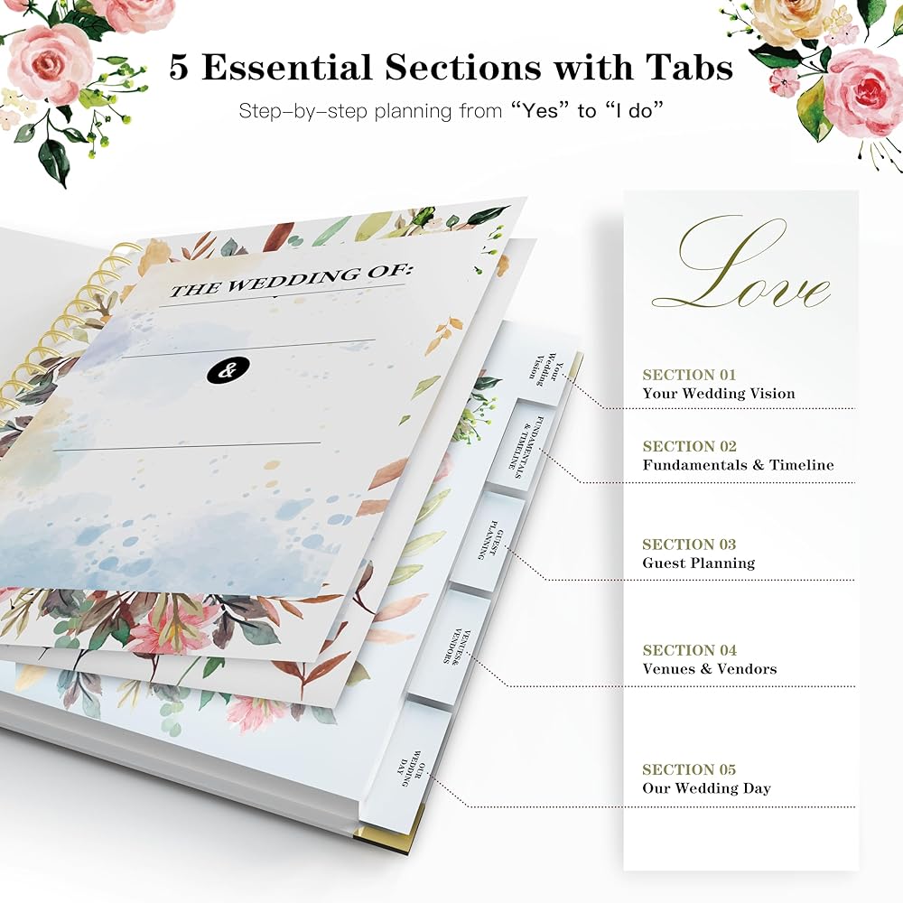 COMPREHENSIVE WEDDING PLANNING SECTIONS: Includes 132 pages organized into thematic tabs for your wedding vision, fundamentals & timeline, guest planning, venues & vendors, and wedding day. Each part attaches a convenient pocket holder for magazine cut-outs, business cards, and inspirations. The wedding planning book ensures seamless planning of every detail for your big day to the honeymoon.