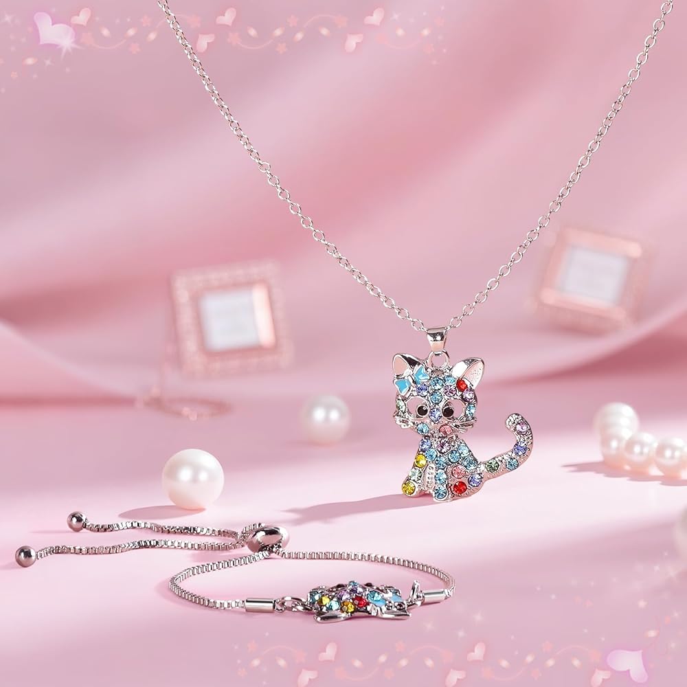 【Cat Themed Jewelry】- The silver color necklace and bracelet combine the cute animal "cat" shape with the decorative rhinestone. The glittering, lovely and creative, cool and fashionable jewelry for girls.