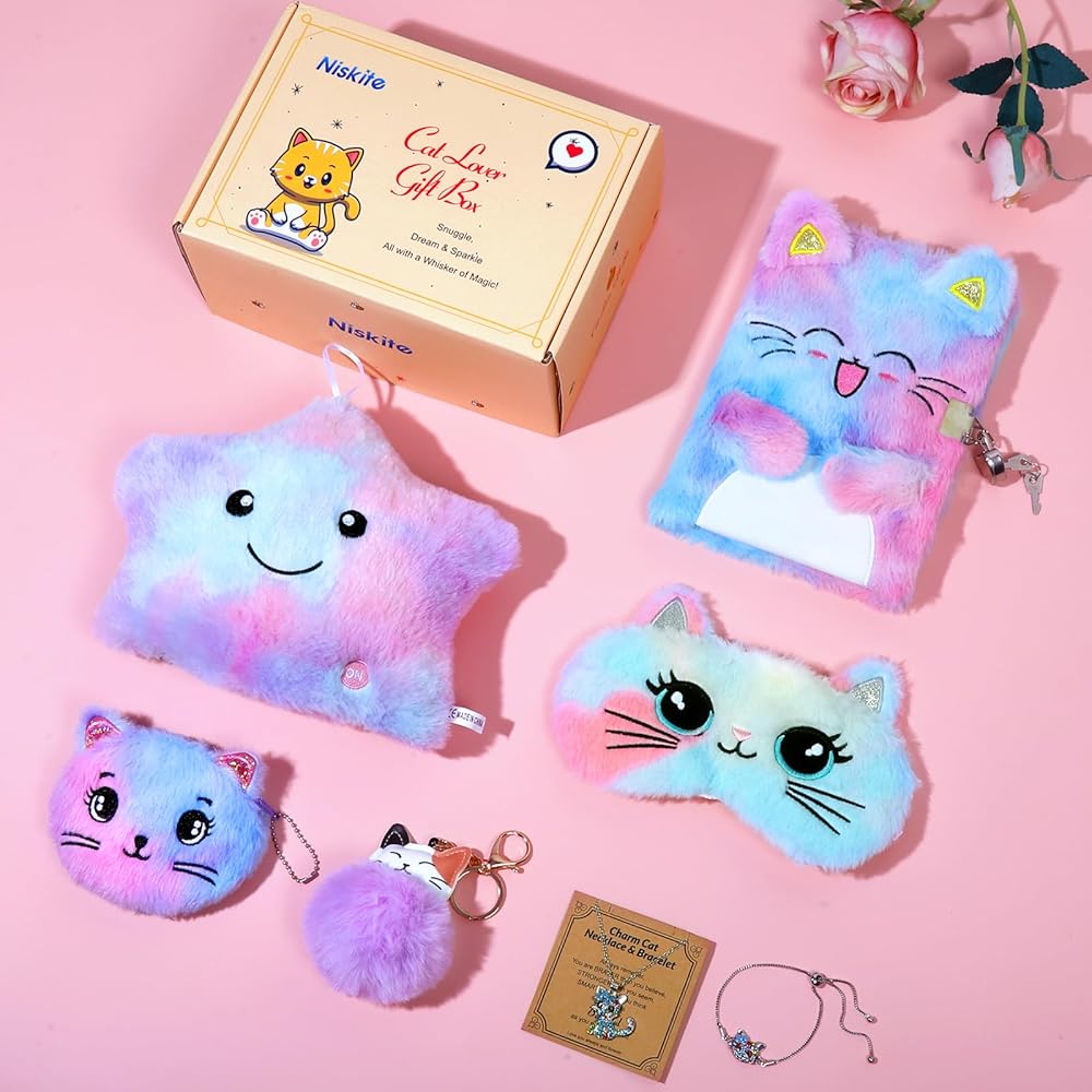 【Valuable Cat Themed Gifts For Girls】- The cat gifts set for kids include a happy cat dairy with locked,light up star pillow,lovely cat coin purse,eye mask,cat themed keychain,bracelet and necklace,Perfect girl gifts for cat lovers.