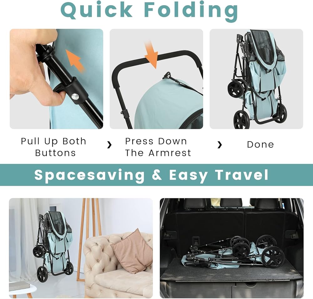 【QUICKLY SET UP & FOLDING】The dog stroller easy to setup in few minutes with the install manual and no tools required; When you done, fold the stroller easily with a press of a button on the handle; The folded cat stroller size is 32.5"H x 20"W x 14"L and weighs only 17lbs, you can put the cat stroller into the trunk of the car; Great for travel and camping & create minimal space for storage.