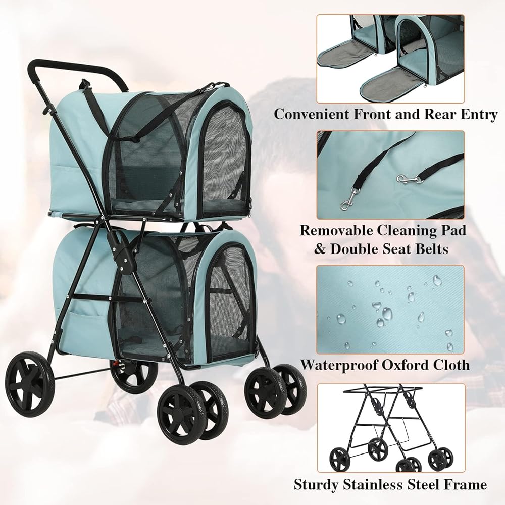 【HIGH LOAD-BEARING& LARGE SPACE】The structure of the double dog strollers is made of superior strength rigid steel frame, equipped with strong and low water penetration 400D Oxford Cloth, each layer hold any pets at least 17lbs weight; This double-layer designed Dog Stroller has enough space to accommodate medium or large pets, or a few smaller furry friends, your little cute animals will never feel crowded again.