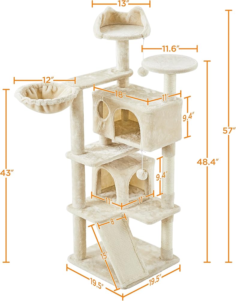 ROCK-SOLID STABILITY - Engineered with a reinforced base, anti-toppling straps, and robust threaded rods, this 57.5″ tower stays steady during wild adventures. Ideal for naps or high-energy leaps, it's built to handle all size breeds cats without wobbling