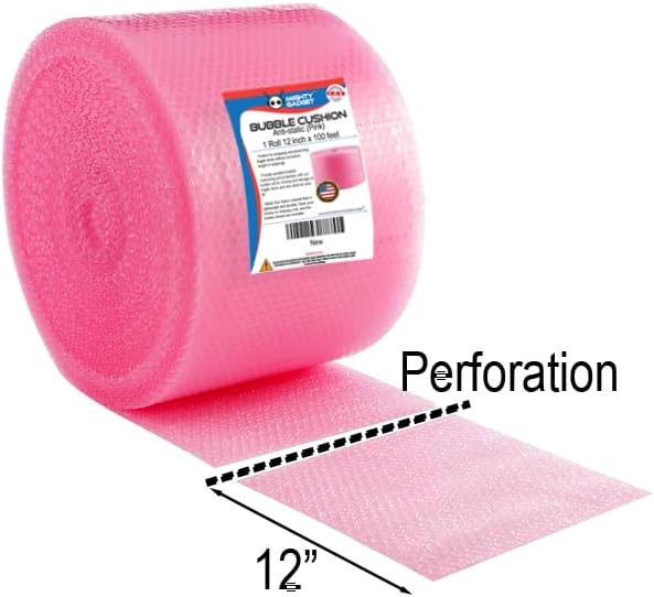 2 Pack of Mighty Gadget Bubble Cushioning Wrap Rolls, 12" x 72’ ft Total, Perforated Every 12" for Packaging, Shipping, Mailing Free Bonus Fragile Stickers Included (Pink Antistatic)