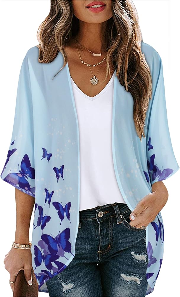 Floral Cardigan,Casual summer plus size tops,Kimono beach cover ups,Chiffon shirts,Open Front,Loose Puff Sleeve outwear.