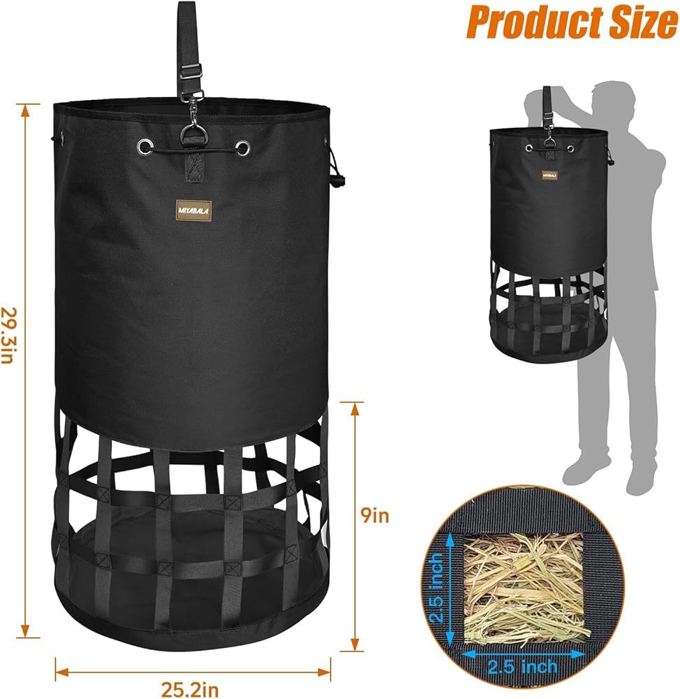 Large Capacity Cylinder Design: Featuring a spacious cylindrical shape, Dimension of 25 inch diameter with 29 inch high,our hay bags provide ample storage capacity for hay, ensuring an extended supply to sustain animals over prolonged periods.