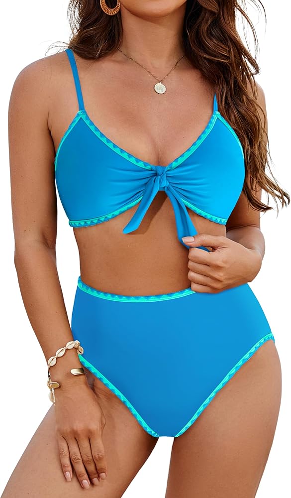 Cheeky bikini set features sexy v neck tie knot front bikini top and high cut bottom. Top with adjustable spaghetti strap, removeable soft bra padded, haven't underwire, wide back band, good to cover your body.