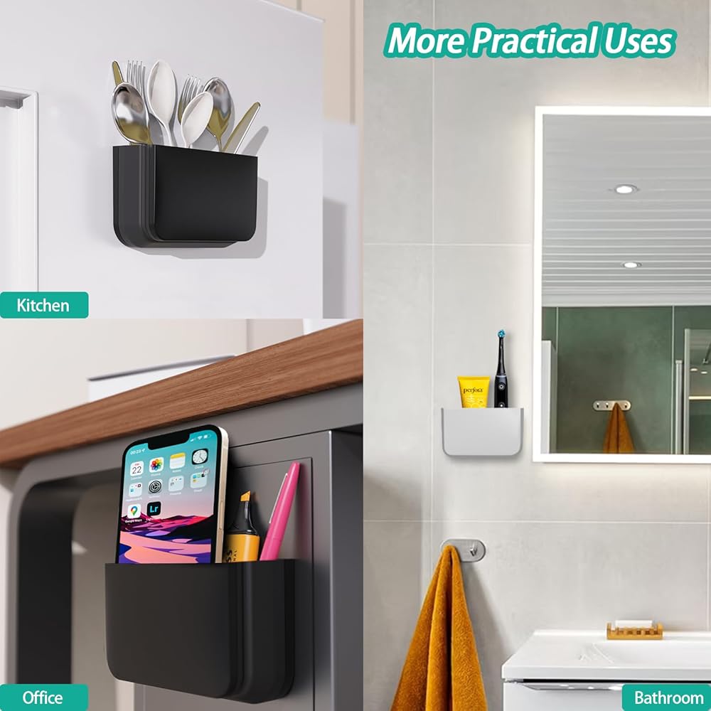 This Multifunctional Magnetic Organizer Is Compatible with 5 Scenarios: Remote Controls, Stationery, Digital Devices, Kitchen Items, and Bathroom Essentials. ① As a remote control holder, it fits almost all types of remotes. ② As a stationery pen holder, it can hold whiteboard markers and erasers, as well as pens, pencils, dry erase markers, sticky notes, clips, staplers, and other stationery. ③ Easily stores small digital gadgets such as smartphones, chargers, cables, and earphones. ④ Keeps kitchen utensils like forks, knives, and spoons organized. ⑤ Ideal for storing bathroom essentials including toothbrushes, toothpaste, combs, hair accessories and more.