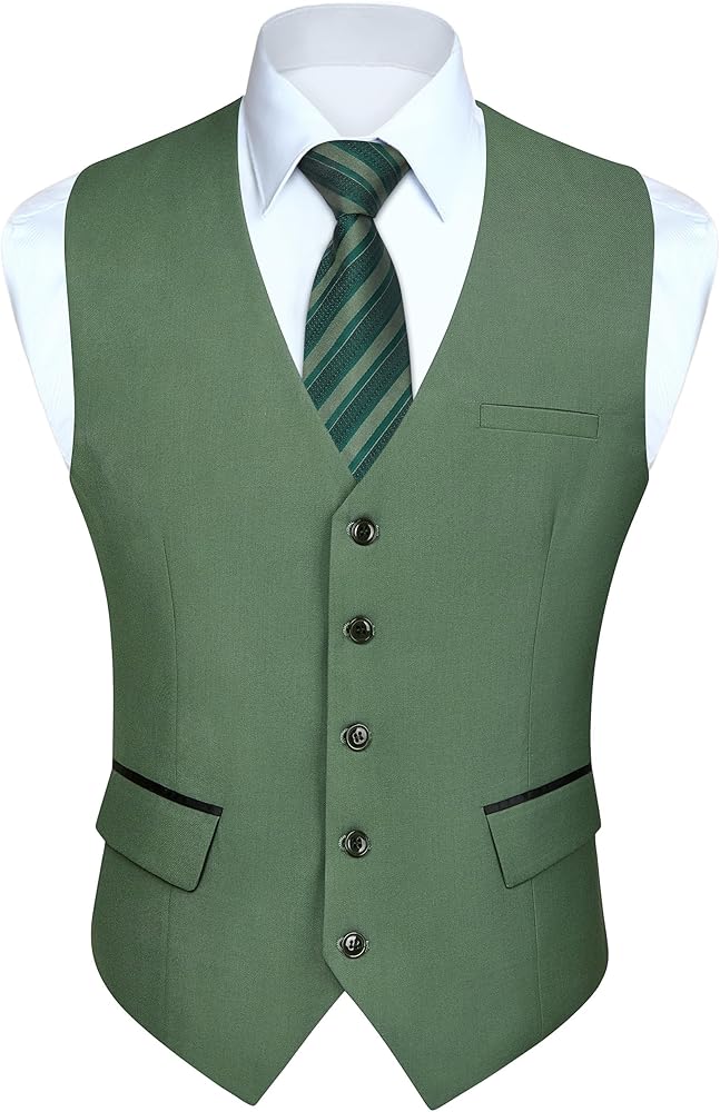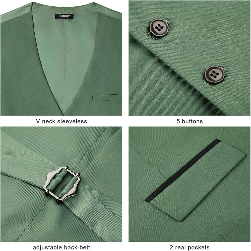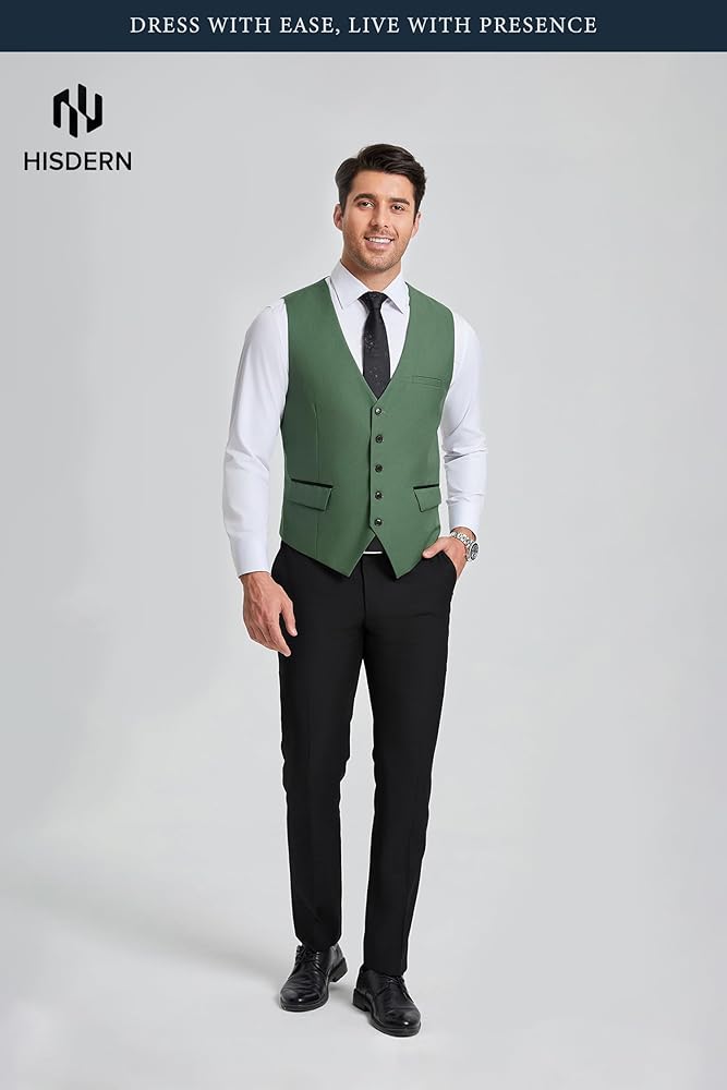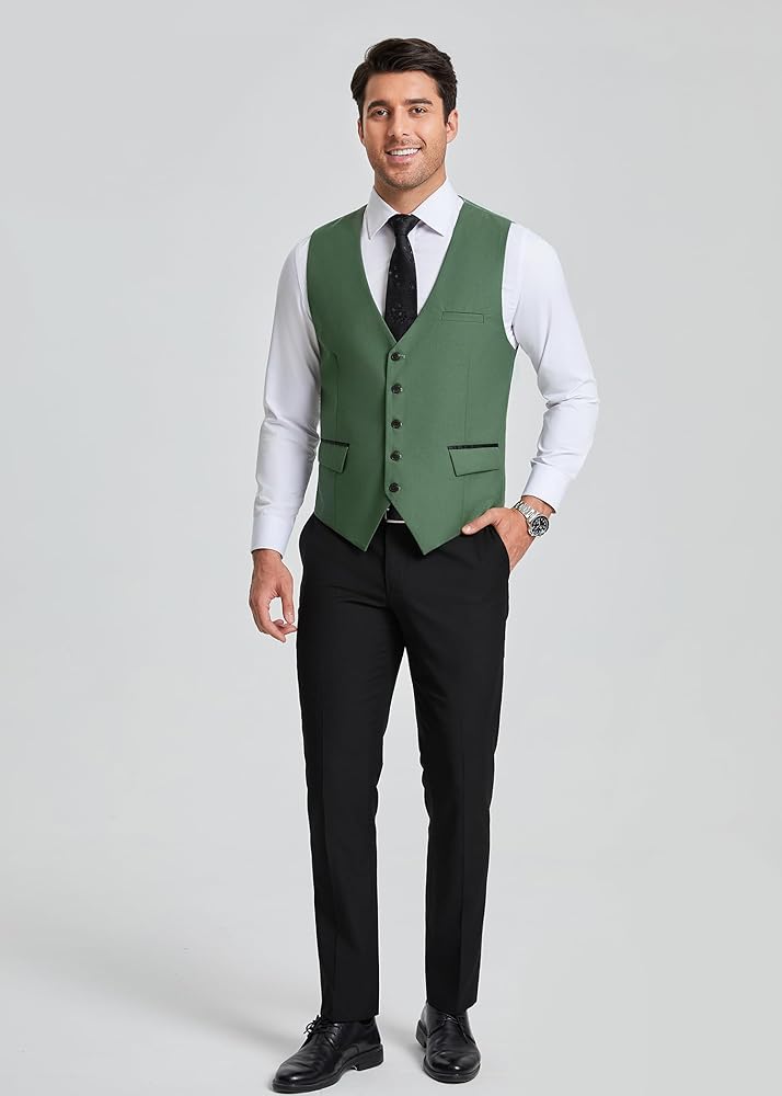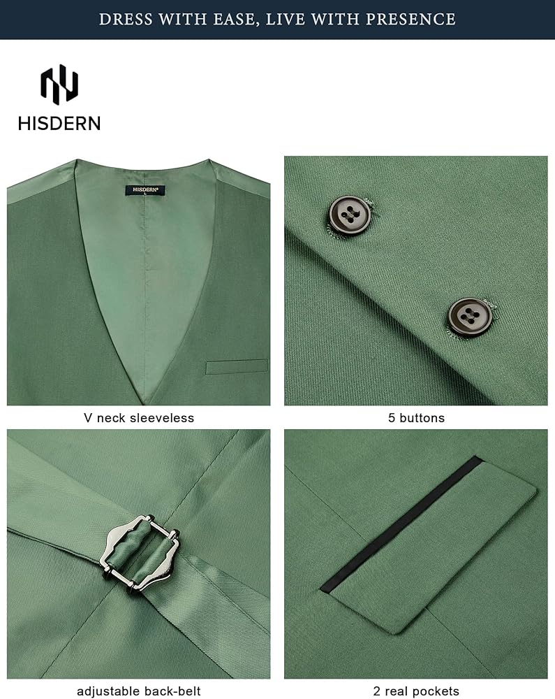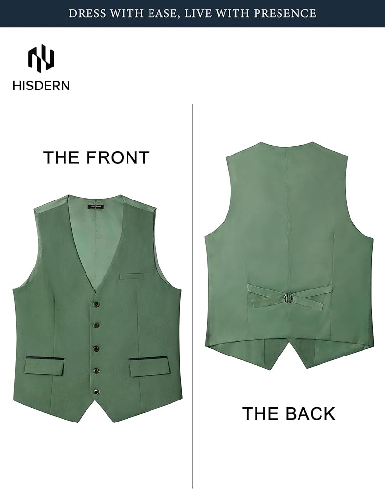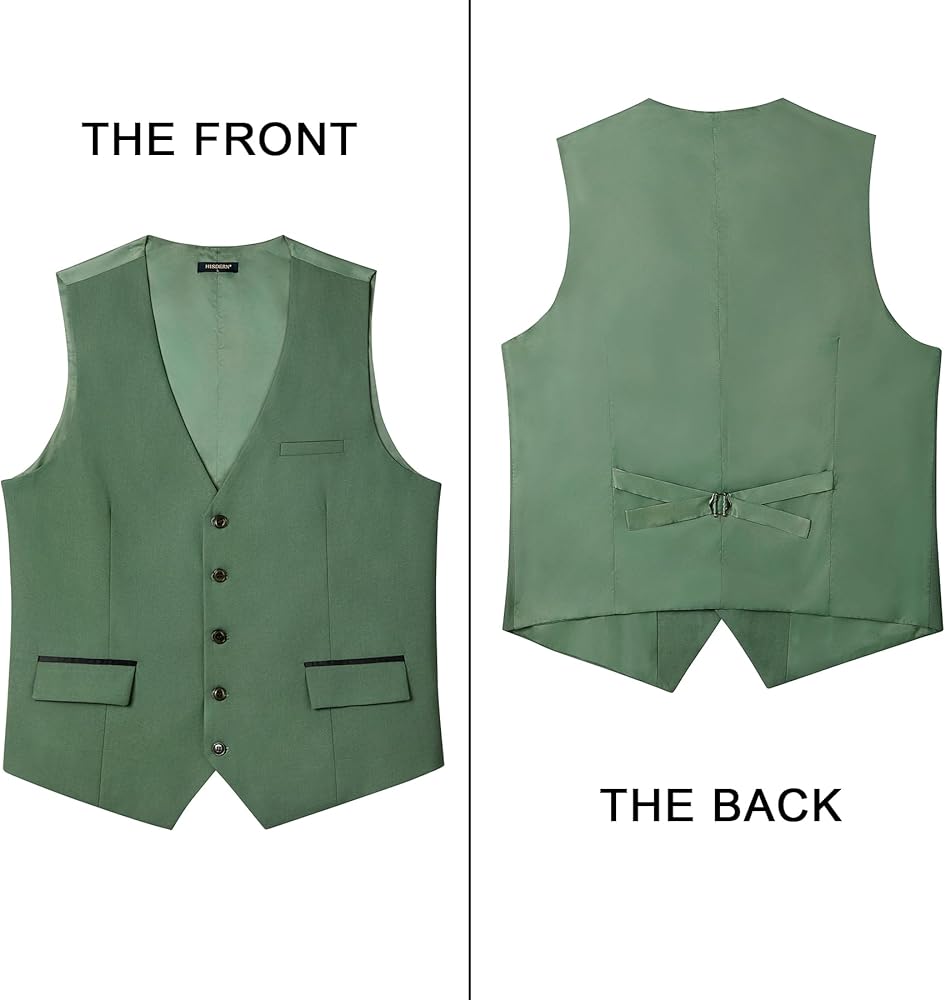 🔹【Unique design】mens suit vest has a unique and classic design. classic V-neck style, Single row of five buttons slim fit waistcoat, Adjustable back buckle, two real contrast color side pockets (Need to cut the thread when using pockets)