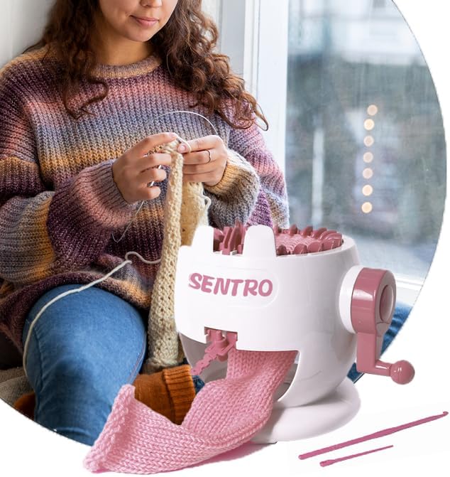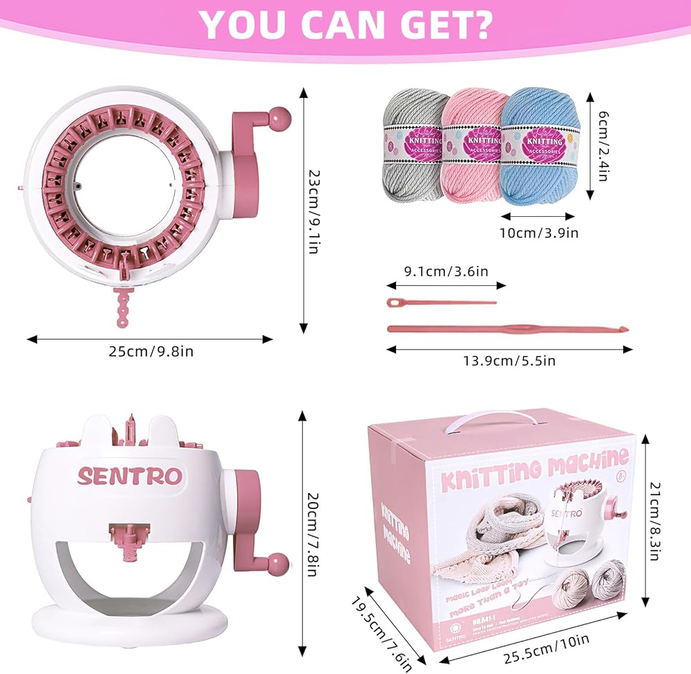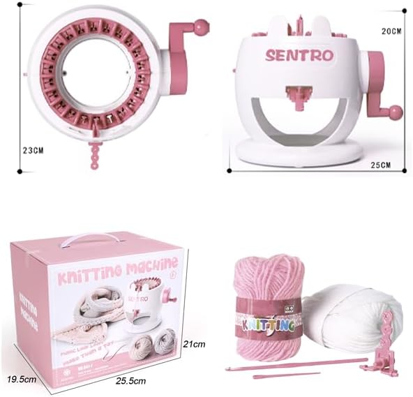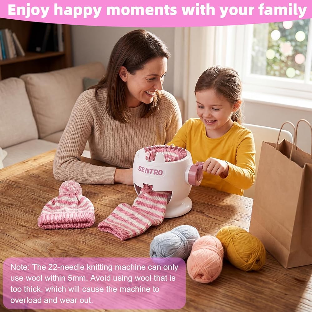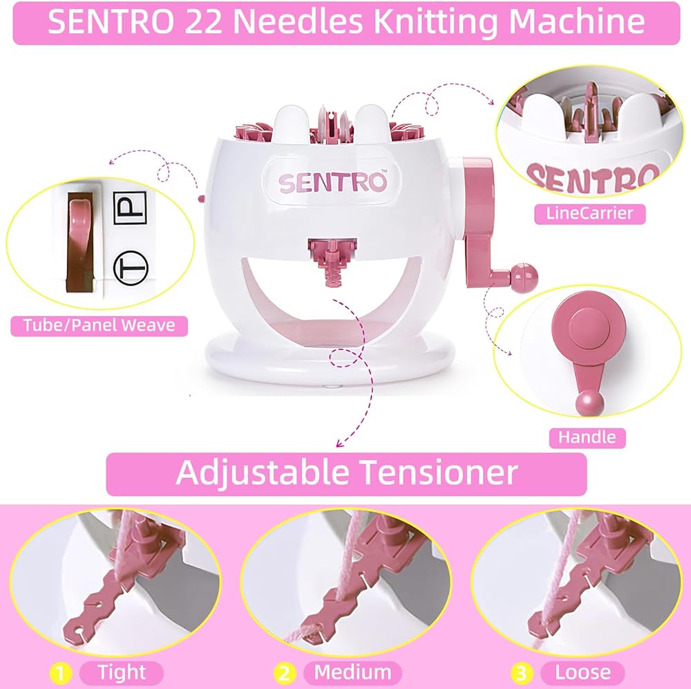 SENTRO 22 Needle Rabbit Knitting Machine Kit This 22 needle rabbit themed knitting machine makes it easy and fast to craft unique fashion accessories like hats, scarves, socks, and more. How to Use Let's thread and start knitting: Simply insert yarn into the spindle and turn the manual crank to create flat or round stitches instantly. Create Almost Anything: Knit hats, scarves, gloves, socks, leg warmers, and clothing with ease. 3 Step Quick Guide STEP 1 Leave a 30 cm yarn strand in the center of the machine. Hang the yarn on the white crochet hook and wind it around the hook. (First lap ensures all needles are properly laced; re-do if needed.) STEP 2 After the first lap, pull the yarn through the guide and place it into the tension lever. (Maintain steady, constant speed for the first 3-4 laps to avoid needle drops.) STEP 3 Continue cranking clockwise until the project is complete. (Avoid excessive force or rapid speeds to protect the machine and prevent needle issues.) Product Highlights User Friendly: Perfect for beginner knitters and seasoned crafters alike. Ideal Gift: A fun and meaningful present for children, friends, and neighbors.