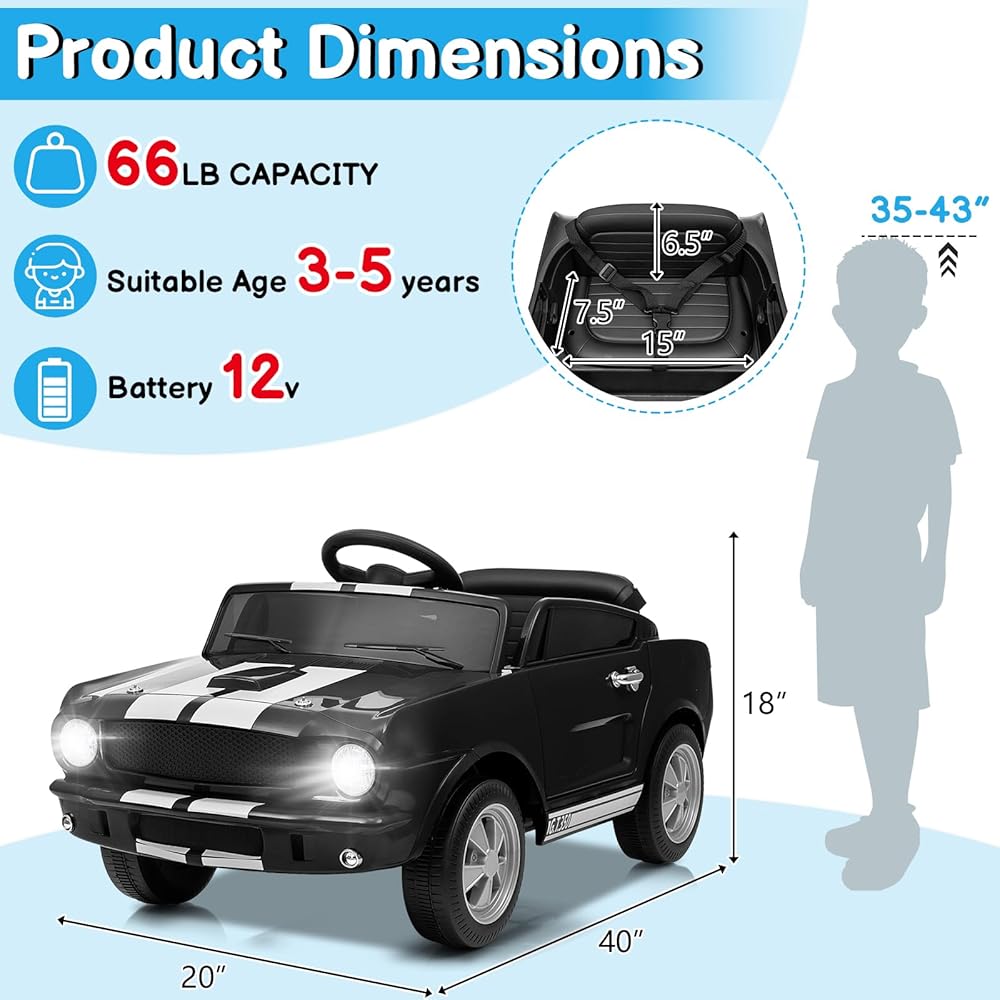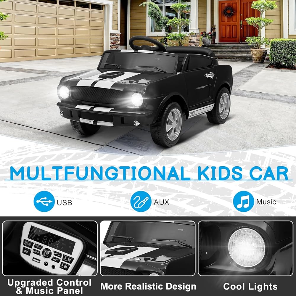 Winado 12V Licensed Shelby Electric Car for Kids, Battery Powered Ride On Toy for Toddlers with Remote Control, Upgrade Panel, Bluetooth, Shock Absorbers, Safety Belt, 3 Speeds, LED Lights - Black