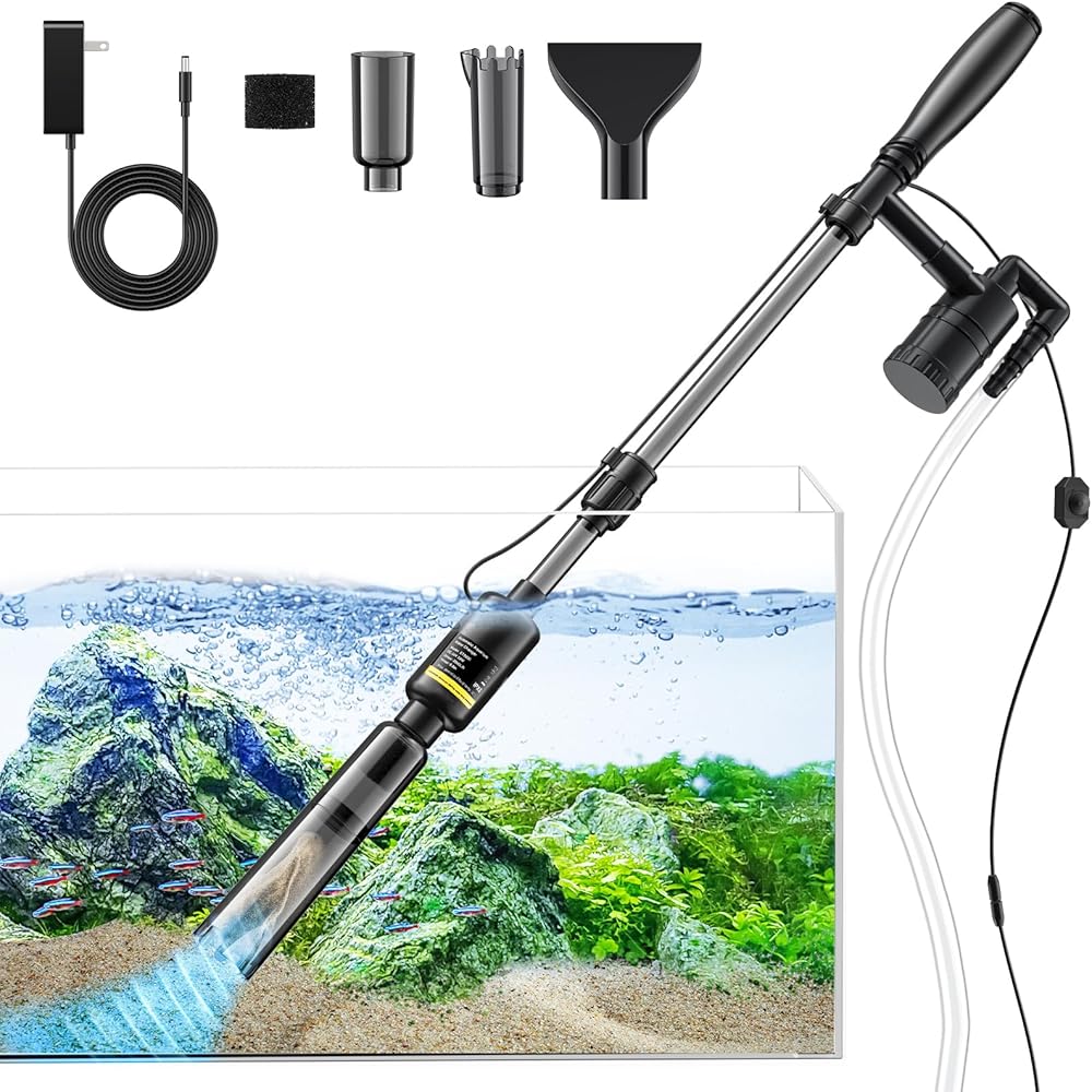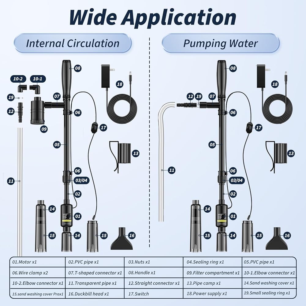 【Easy to Use】 The electric fish tank cleaner vacuum saves time and effort over manual water changes and manual tank cleaning. It uses a 4-layer filtration system, When using, hold the handle and press down, water will automatically be sucked into the pipeline and flow out through the hose. It can efficiently filter fish feces and food debris to filter water and circulation in the fish tank. The filter sponge can be washed and reused repeatedly.