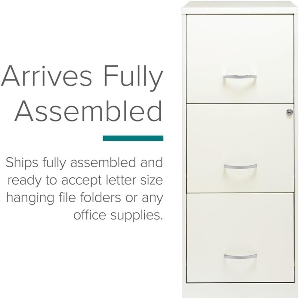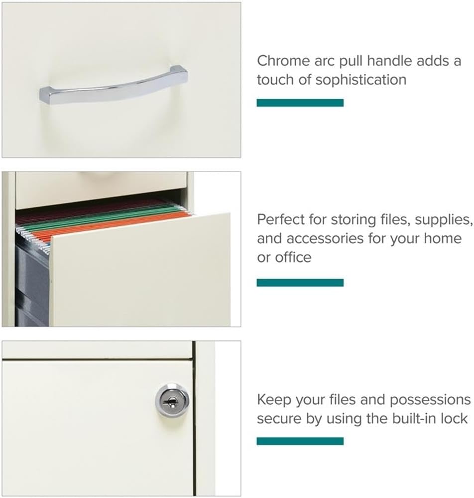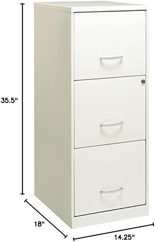 The 3 Drawer Metal File Cabinet in Silver is the perfect design for small office or home office use. This file cabinet is a smart, efficient design for smaller spaces. This cabinet features three high-side drawers which accommodate letter-size hanging files. The drawers can also be the perfect storage solution for other office essentials. Each drawer features a patented glide suspension for a smooth open and close motion and a three-quarter drawer extension to help you locate your files easier. In addition, you can keep your files and possessions secure by using the built-in lock for both drawers. Painted steel surface is non-porous and easy to clean and sanitize. Bring organization and function to your home or office with this stylish three-drawer file cabinet. Your supplies and files will always be organized and within reach! Features: - Drawers accommodates letter-size hanging file folders - Full high-side drawers provide storage for other office essentials - Smooth patented glide suspension - Cam lock secures top two drawers - Three-quarter drawer extension - Painted steel surface is non-porous and easy to clean and sanitize. - Ships fully assembled Specifications: - Size: 35.50" H X 14.25" W X 18.00" D - Product Weight: 27 Lbs - Assembly Required: No - Assembly details: To ensure the key for this product does not get loose, slide the thumb latch on left side of handle to the right, at the same time, pull the drawer open. Keys are hanging inside the cabinet by the locking mechanism.