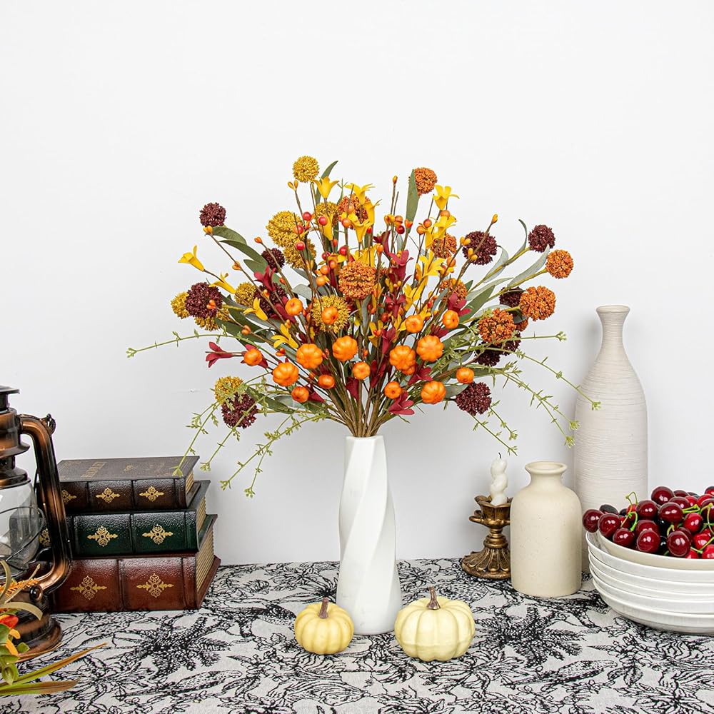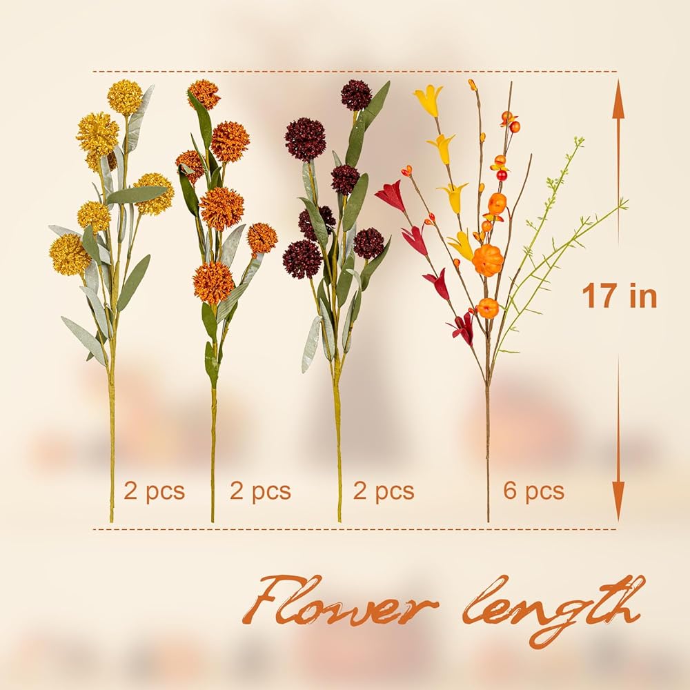 Premium Quality & Versatility - Each durable flower stem is 17 inches long, allowing flexible styling in bouquets, garlands, or standalone accents. The pumpkin picks and dandelions add whimsical charm.