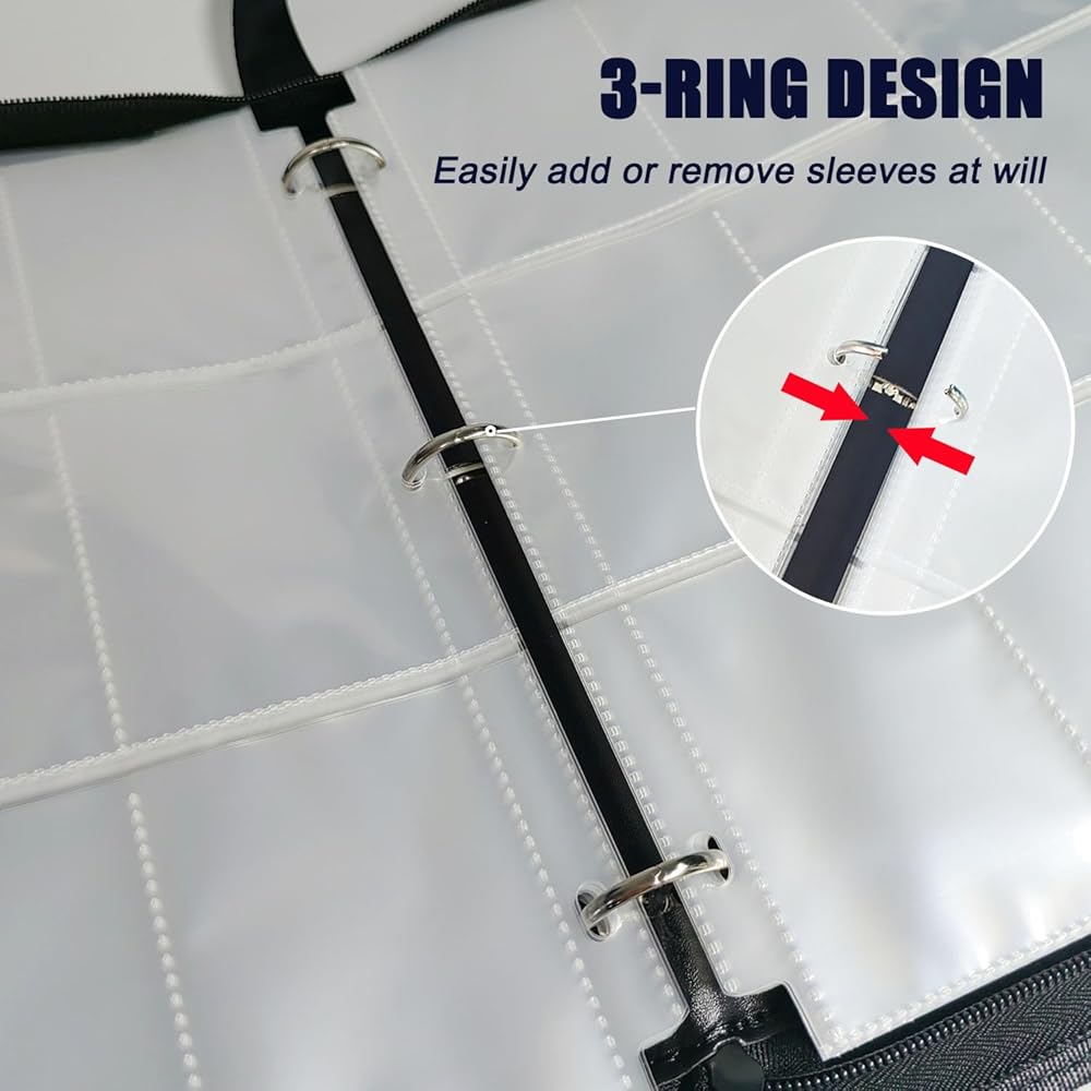 【3-Ring Binder with 50 Removable Sleeves】The large capacity 4 pockets card holder binder include 50 double-sided sleeves, holds up to 400pcs standard size cards. The 3-ring design allows you to add or remove the sleeves at will.