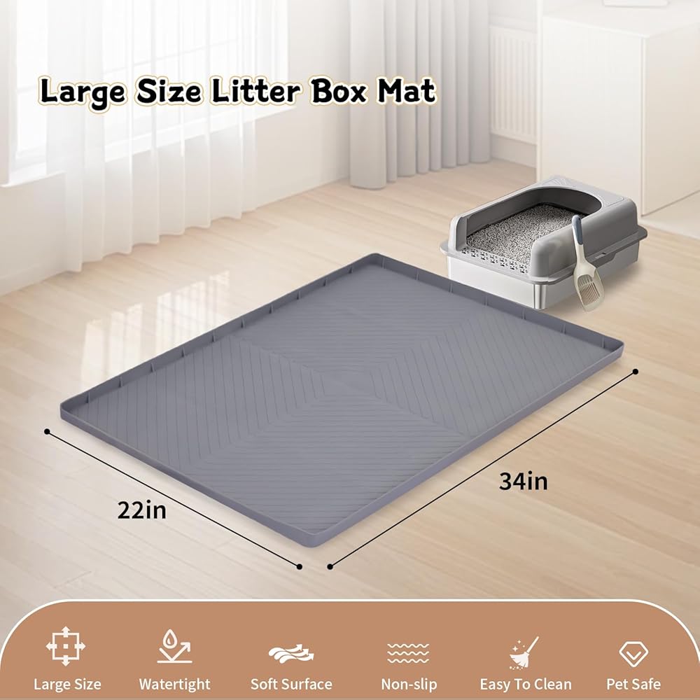 INNOVATIVE DESIGN: The cat litter mat has been upgraded based on repeated tests. The grooved design can not only releases the litter from cat's paws, but also quickly collects loose litter and directs it to the litter box. The mat features a large size 34" x 22" to trap and collect litter more efficiently. You can reduce sweeping around the litter box