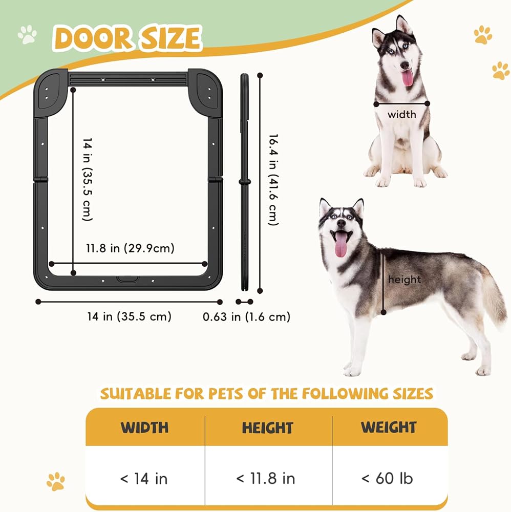 Pet Freedom & Convenience: Ideal for busy pet parents, our dog door for screen door offers a practical solution to allow your furry friend to come and go as they please without needing to open the door every time.Inner flap: 14×11.8 inches; outer frame: 16.4×14 inches. Suitable for pets up to 60 pounds.